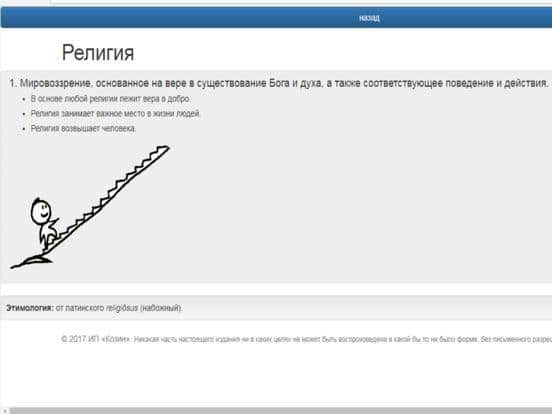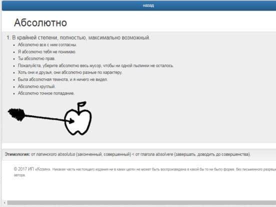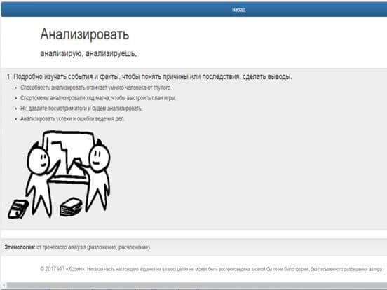 Basit sözlük sadece öğrenciler için değil, aynı zamanda herhangi bir kelimenin anlamı, kökeni ve yapısı ile ilgilenen herkes için gereklidir. Bu kullanımı kolay iTunes programı, arama çubuğunda gerekli kelimeyi hızlıca bulmanıza, anında açıklamasını vermenize, uygun bir görüntü göstermeye ve ayrıntılı bir açıklama sunmaya yardımcı olacaktır. Sözlük, 1 milyondan fazla kelime ve terim içermektedir, ayrıca İngilizce'den çeviri yapma işlevi mevcuttur. Renkli ve basit arayüz, menünün çeşitli işlevlerini kolayca anlamanızı sağlar.