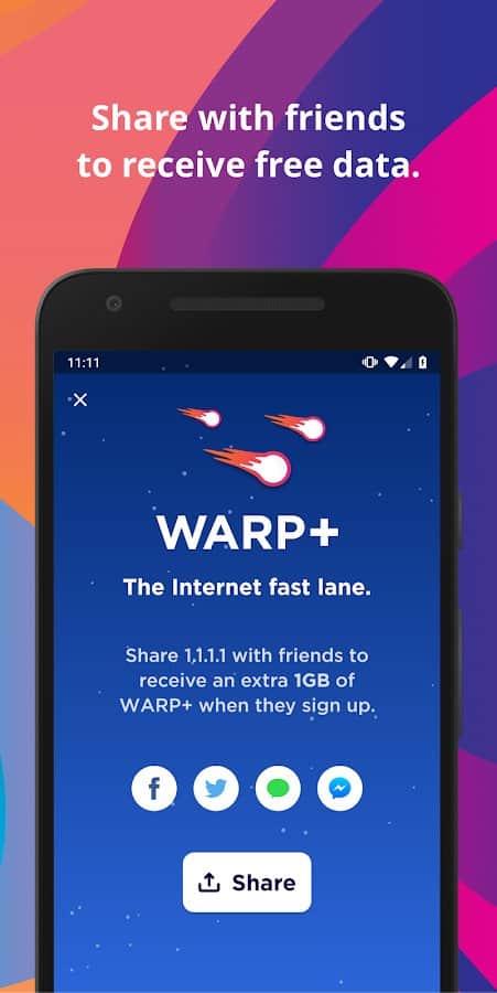 • WARP +, trafiğinizi internet yoğunluğundan kaçınan ağımız üzerinden yönlendirir. WARP +'yı denemek için arkadaşlarınızla referans kodları paylaşabilirsiniz. Onlar uygulamayı indirip etkinleştirdiklerinde, siz ve arkadaşlarınız WARP + kredileri alacaksınız.
