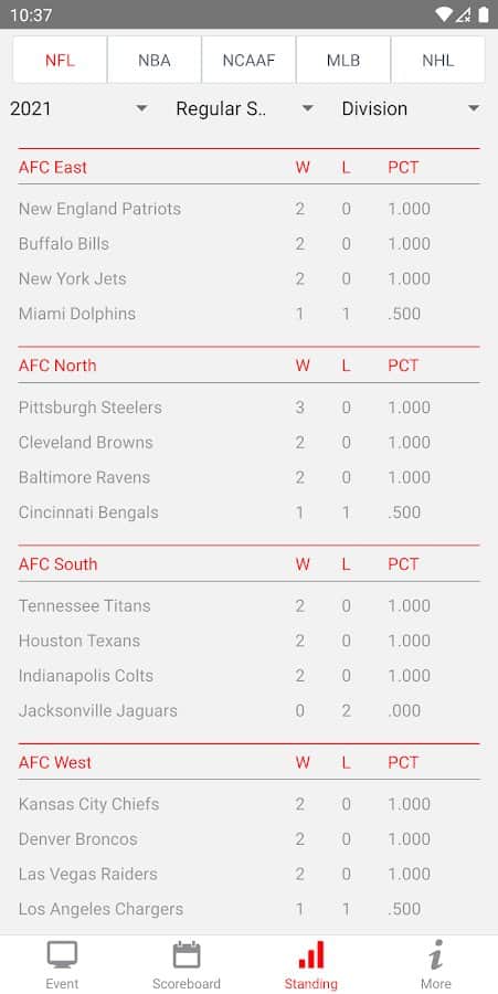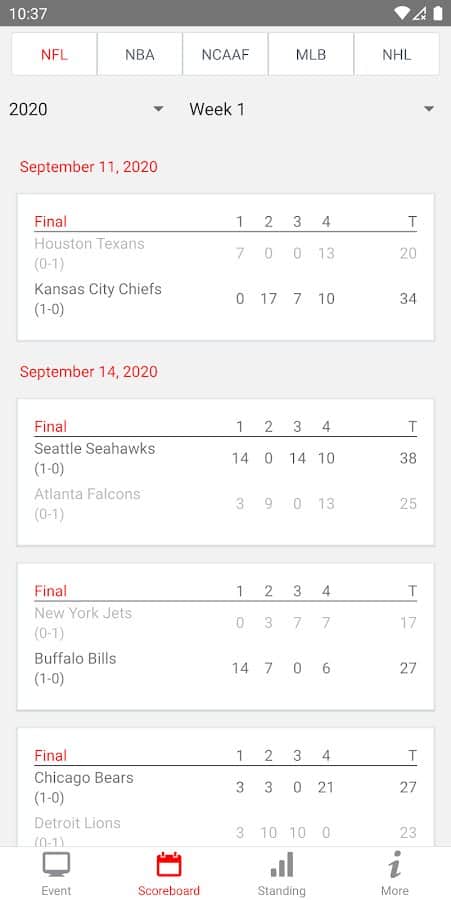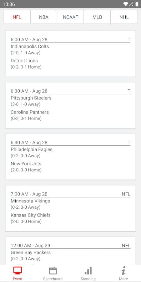 Bu, NFL - Futbol, NCAAF - Kolej Futbolu, NBA - Basketbol, NHL - Buz Hokeyi, MLB - Beyzbol için en iyi uygulamadır ve keyifli bir izleme deneyimi için mümkün olan en fazla özellikleri sunmaktadır.