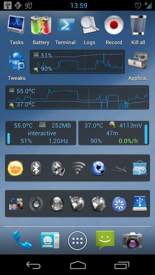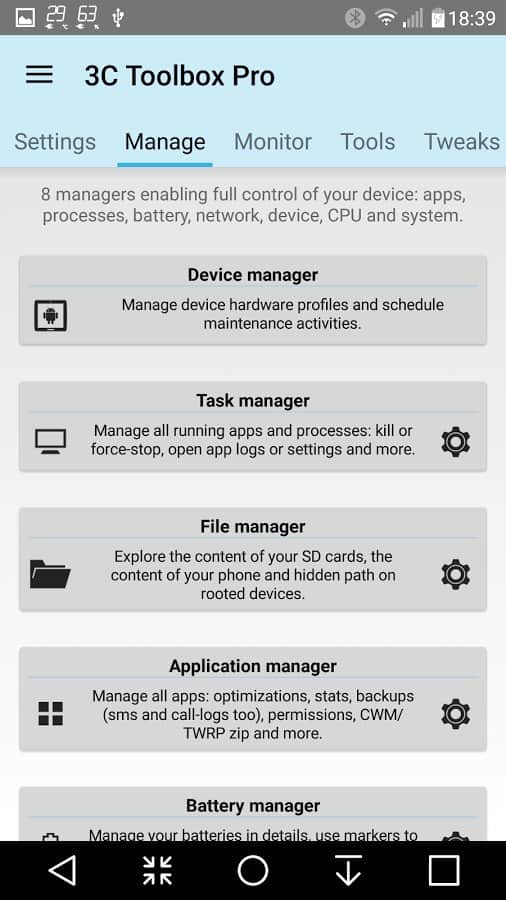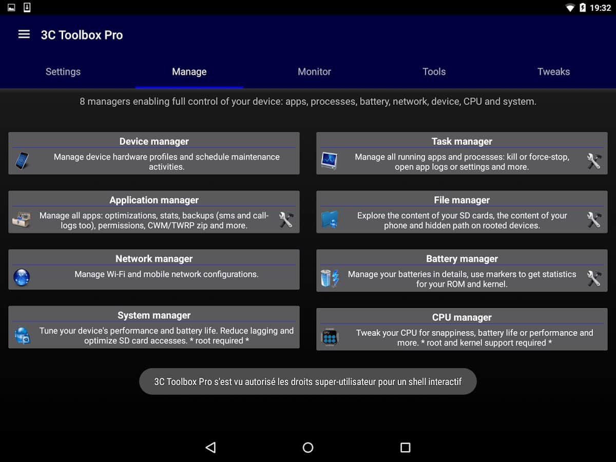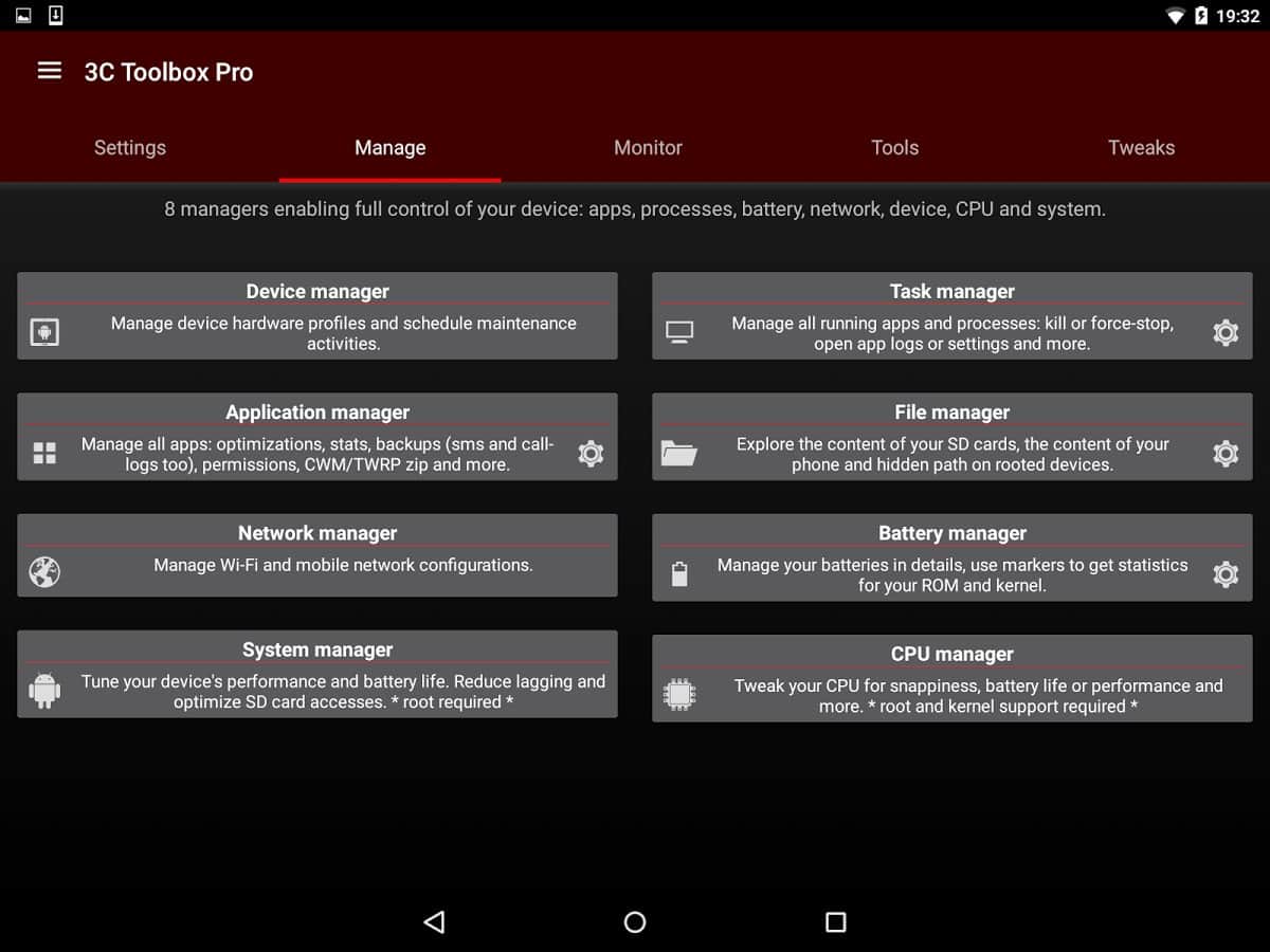 3C Toolbox – Bu uygulama ile cihazınızın tüm yönlerini tamamen kontrol edebilirsiniz. Hatta yalnızca root erişimi ile erişilebilen özellikler bile burada mevcut. Düğmelerin, dilin ve temaların ayarlanması, ana ekranın düzenlenmesi veya işlemci sıcaklığı. Tek bir uygulama içinde toplanmış her şey burada. Eşsizdir ve akıllı telefonun sistemlerini ve uygulamalarını yönetmek için 80'den fazla aracı bir araya getirir.