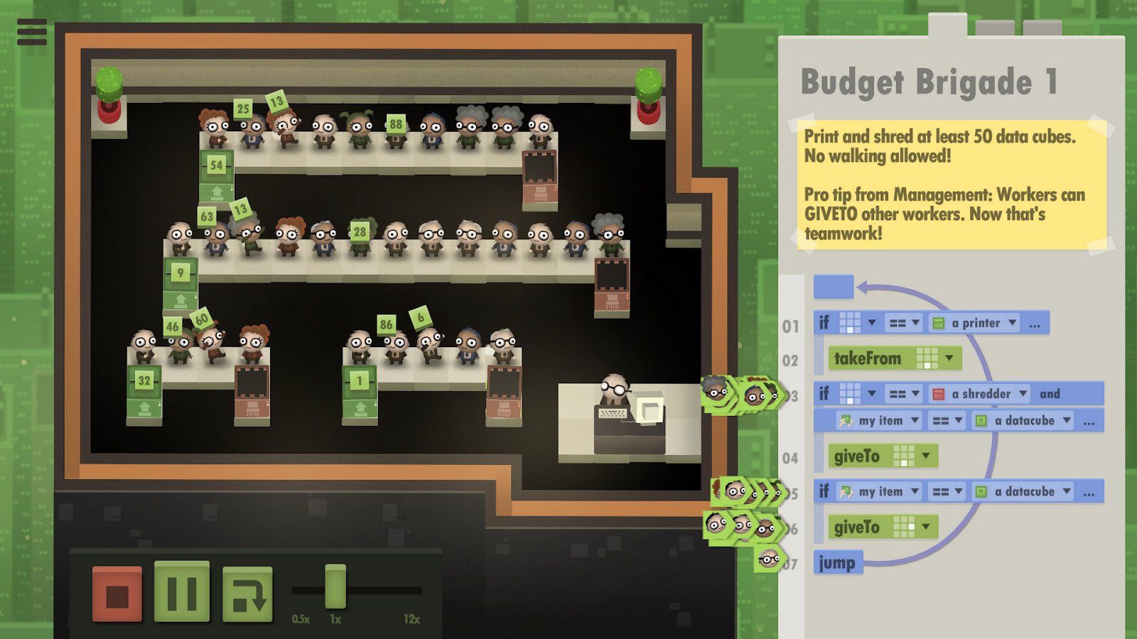 7 Milyar İnsan - Kendi ofis ekibinizi yönetebileceğiniz seviyeye yükselin. Programlama becerileri öğrenin ve her birine görev vermek için gerekli komutları verin, böylece bulmacaları çözerek seviyeleri geçin. İpuçlarını kullanın, bir problemi nasıl çözeceğinizi düşünün, yeni şeyler öğrenin, yeteneklerinizi geliştirin ve sadece sürecin tadını çıkarmakla kalmayın, aynı zamanda oyunun sıradışı grafikleriyle de keyif alın. Oyunda ayrıca Rusça da dahil olmak üzere yaklaşık 11 farklı dile çevrilmiş içerik bulunmaktadır.