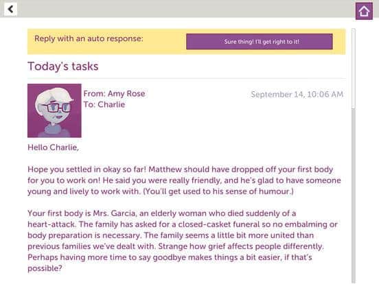 Bir Morgcunun Hikayesi – IOS için sıra dışı bir oyun, burada cenaze evi yöneticisi rolünü üstleneceksiniz. Bu oyunda, cenaze evinin sahibi rolünü alacak, cenaze törenine katılacak ve merhumun yakınlarından hikayeler dinleyeceksiniz. İlk olarak, embalsamaya ihtiyaç duyan Charlie'nin cenazesine katılacaksınız ve ardından onun yakınları ve çalışanlarından ilginç hikayeler dinleyeceksiniz. Batı cenaze endüstrisinin dünyasına mizahi bir bakış açısıyla ve bilgilendirici bir şekilde göz atın.