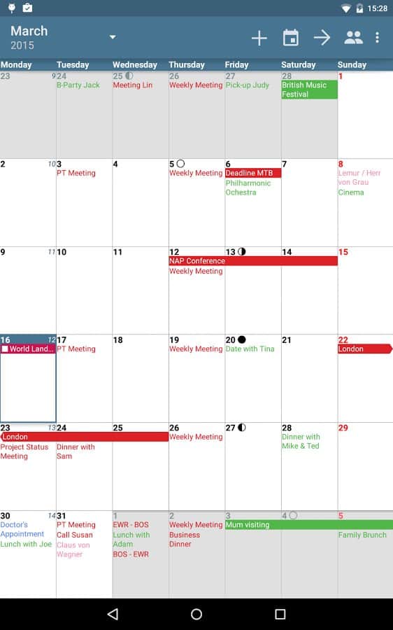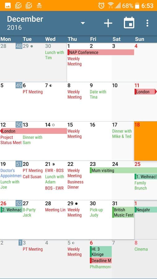 aCalendar+ Takvim & Görevler - Basit ve çok kaliteli bir takvim, cihazlarınız için. Eğer çok fazla kafa yormak istemiyorsanız ve kendiniz için çok fonksiyonel, aynı zamanda basit bir şey arıyorsanız, bu tam size göre. Tarihleri göstermenin yanı sıra, onlarla ilişkili yapılacaklar listelerini de harika bir şekilde yerine getiriyor. Ayrıca, doğum günlerini hatırlayan bir özellik de var, artık kesinlikle kaçırmayacaksınız, size bunun öncesinde birkaç gün önceden haber verecek. Anlaşılır arayüzü, onu yönetmeyi kolaylaştırıyor, ve senkronizasyon özelliği, verilerinizi bulutta saklamanıza izin veriyor. Böylece onları asla kaybetmeyeceksiniz.
