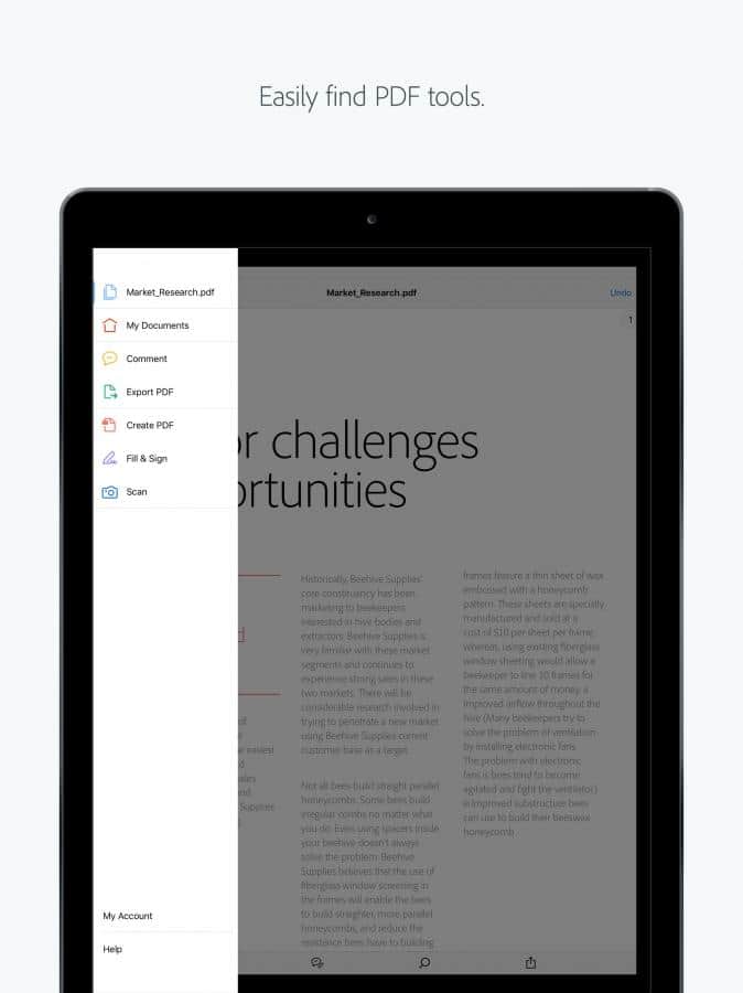 Adobe Acrobat Reader - Pdf ile çalışma imkanı sunmasıyla dünya çapında tanınan bir uygulamadır. Ancak benzerlerinden farklı olarak, bu uygulamanın işlevselliği oldukça ileri seviyededir ve bu tür dosyalarla basit bir şekilde çalışmakla sınırlı değildir. Onları sadece okuyamayacak, aynı zamanda kameranızla kendi dosyalarınızı da oluşturabileceksiniz. Bir belgeyi fotoğraflamanız yeterli, işte o belge artık bu formatta sizde saklanıyor. Ayrıca metni tanıyabilir ve metin belgeleri oluşturabilirsiniz.