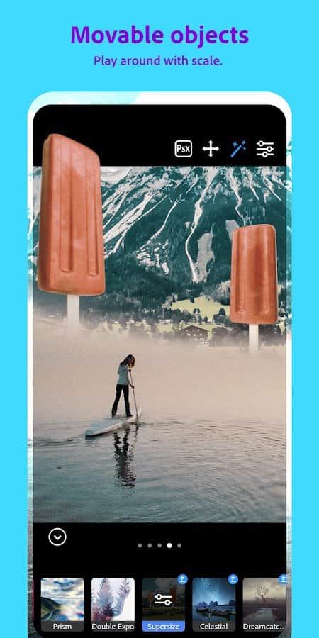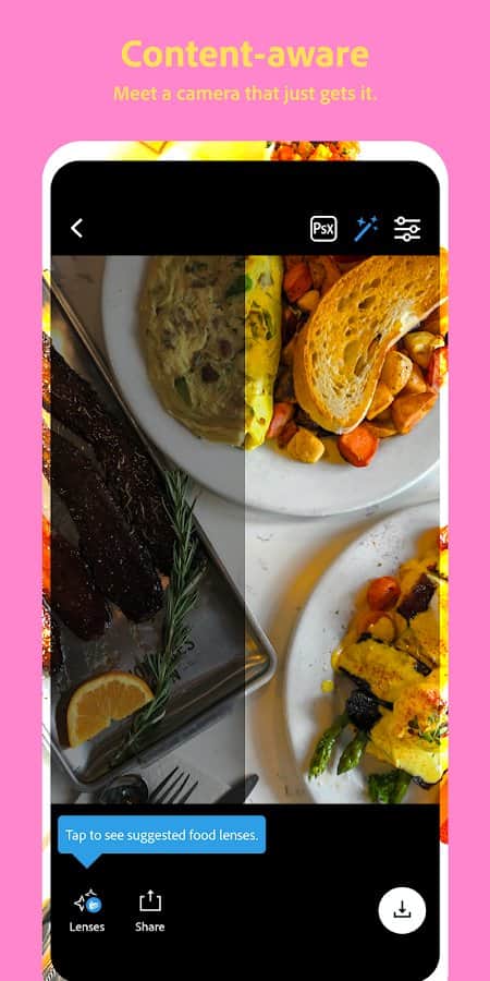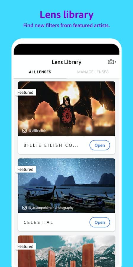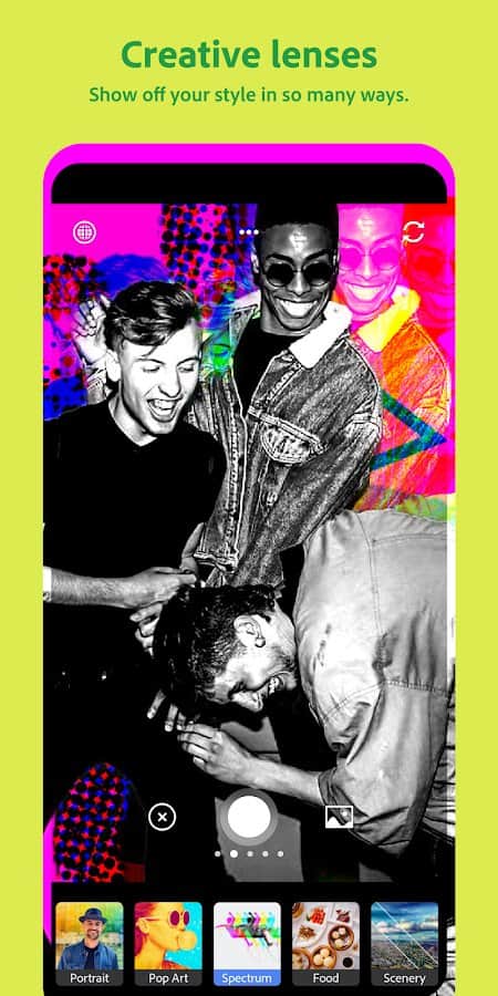 Adobe Photoshop Kamera, fotoğraflarınız için en iyi filtreleri ve efektleri eklemenizi sağlayan akıllı bir kamera uygulamasıdır - hatta fotoğraf çekmeden önce. Kamera, harika selfie'ler, yemek ve manzara fotoğrafları ve daha fazlasını çekmenize yardımcı olacak yapay zeka tabanlı muhteşem özelliklerle donatılmıştır. Filtreler kütüphanesi şunları içerir: Portre, Stüdyo Işığı, Blume, Pop-art, Spektrum, Desink, Yemek, Dekorasyonlar, Doğal Gökyüzü, Analog, Gece Değişimi, Komik Gökyüzü, Galaksiler Arası, Rüya Avcısı, Gökyüzü, Süper Boyut, Çift Poz, Prizma, Renk Yankısı, Karışık Teknik, Mavi Gökyüzü, Sanatsal ve daha fazlası.