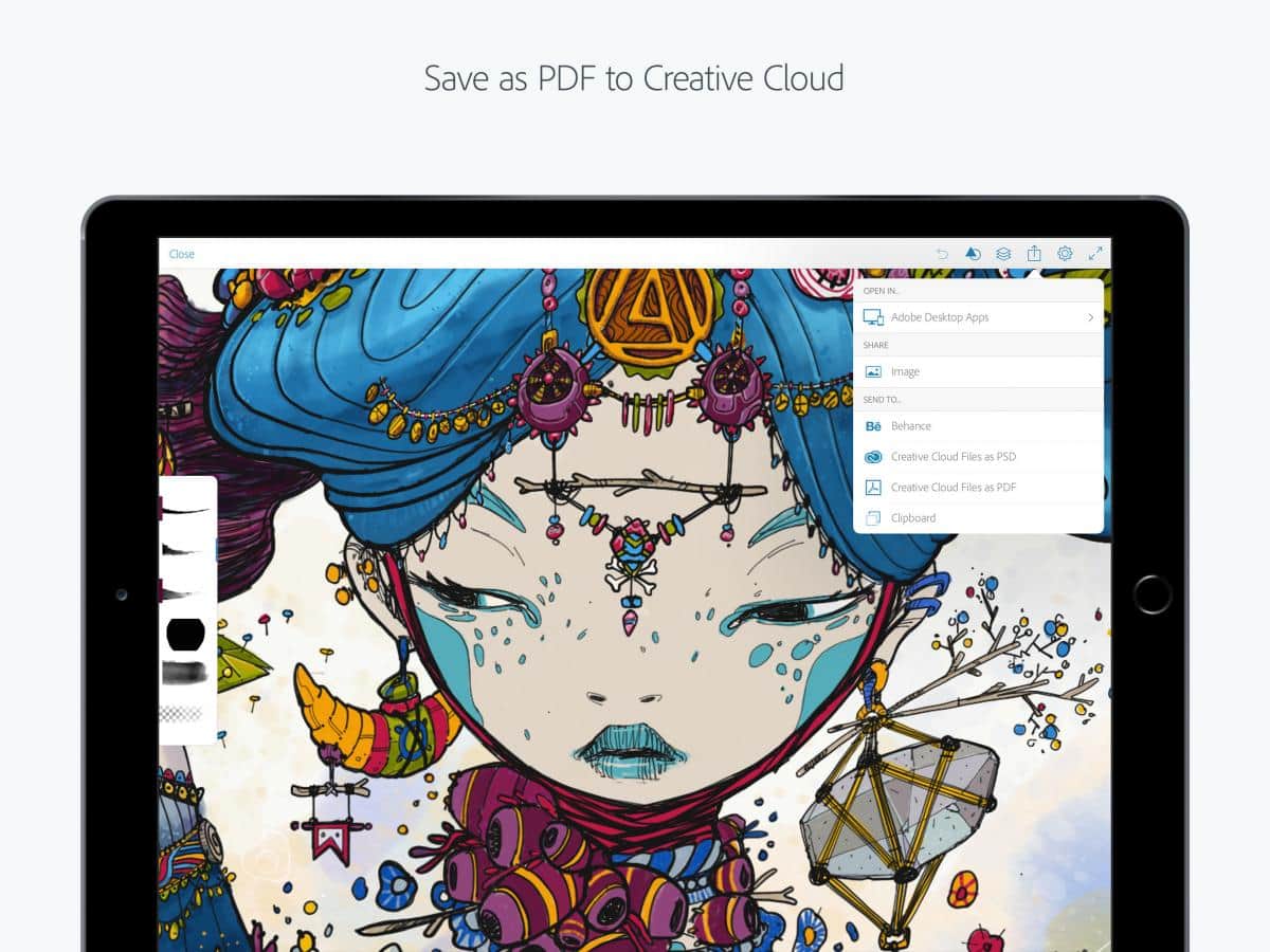 Adobe ailesinin bir ürünü olduğundan, bir diğer önemli avantajı, “masaüstü" Illustrator CC veya Photoshop CC ile entegrasyonu ve Adobe Brush CC, Adobe Color CC gibi araçların desteğidir.