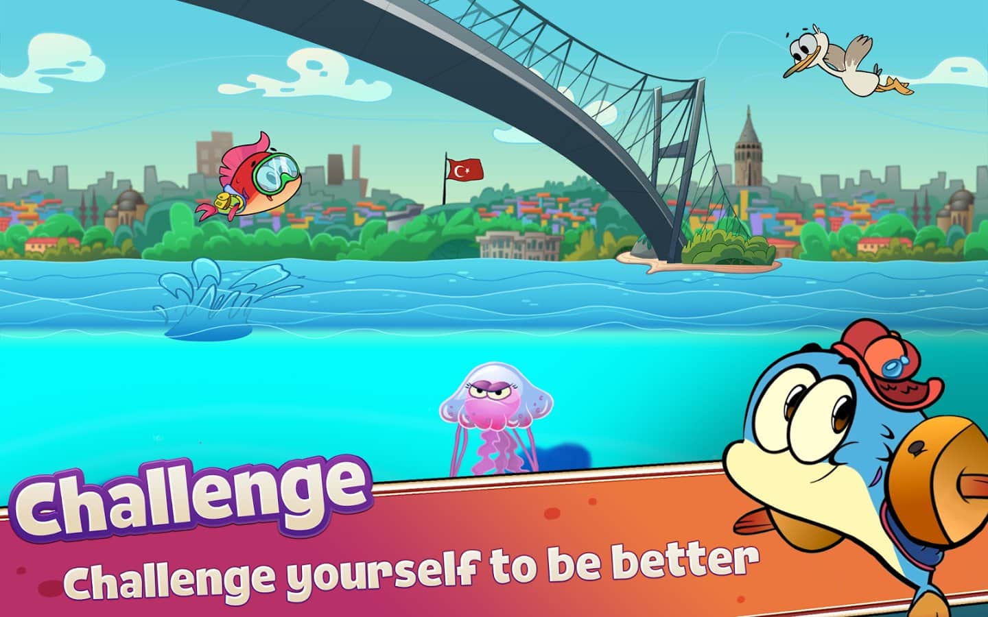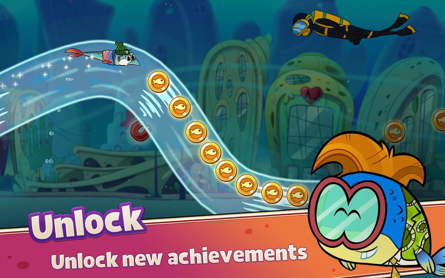 Macera Dolu Finler - küçük balığı kontrol altına alın ve onu oyunun tüm bölgelerinde yönlendirin. Balığımız, yolu üzerindeki tüm engelleri aşarak deniz derinliklerinde yüzüyor, ona mümkün olduğunca çok para toplamasında yardımcı olun. Ekrana bir parmak dokunuşuyla balığın yukarı ve aşağı hareketini kontrol edin. Dalgıçlar, kuşlar, botlar ve diğer balıklar gibi sayısız engelle çarpışmamaya çalışın. Yolda birçok para ve bonus toplayın, bu bonuslar size daha hızlı yüzme veya yolda bulunan tüm paraları mıknatısla çekerek toplama imkanı verecek. Bu oyunda mümkün olan en uzun mesafeyi kat edin ve kendi rekorunuzu kırın.