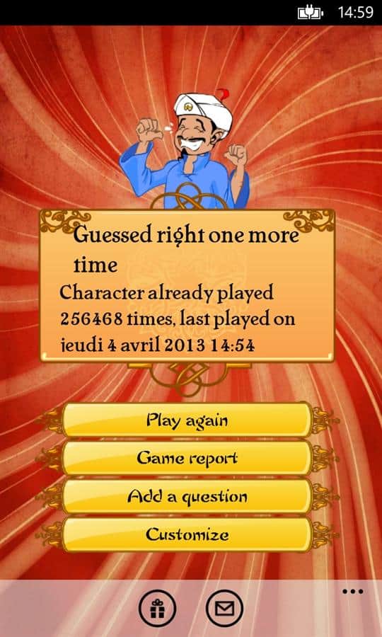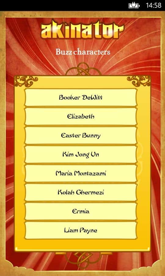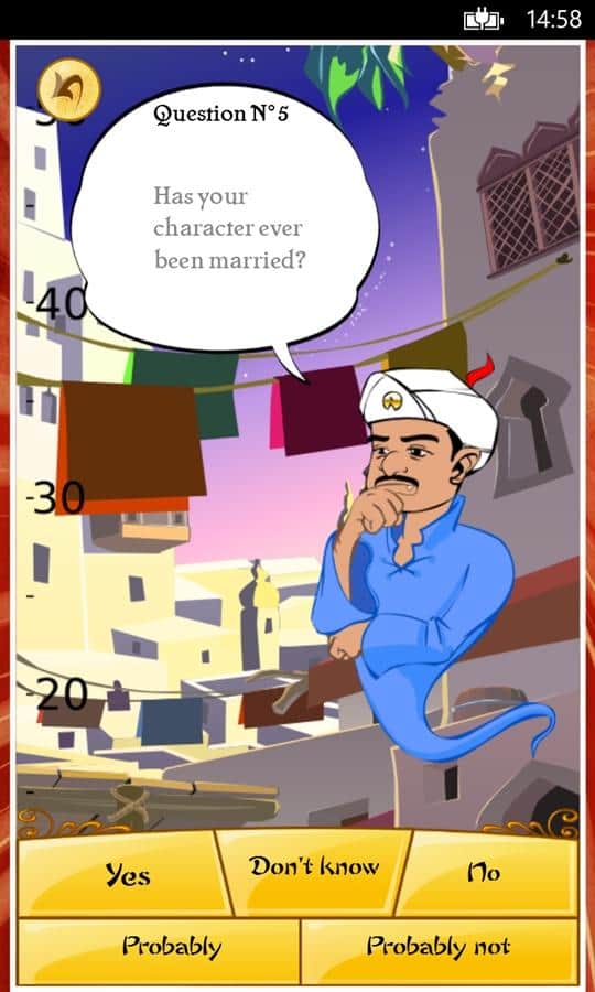 Akinator, Windows Phone için sıradışı bir oyundur. Onun en büyük özelliği, gerçek bir cinle iletişim kurmanızdır ve sadece iletişim kurmakla kalmayıp, belirli bir karakteri düşündüğünüzde, cinin sorularını yanıtlayacak ve birkaç soru sonra, düşündüğünüz kişinin adını söyleyecektir. Bu gerçekten etkileyici. Cinin zorlanması için cevaplarınızı dikkatli verin, ama doğru cevaplar vermeyi unutmayın! Oyun her yaştan insana hitap edecek, çocuklar için özel bir mod da mevcut. Ayrıca, aile ve arkadaşlarınızın fotoğraflarını ve açıklamalarını yükleyebilir ve sonra cinin aniden onların adını söylemesiyle onları şaşırtabilirsiniz! Çalışmak için internet gerekmektedir.
