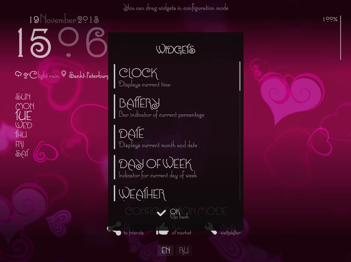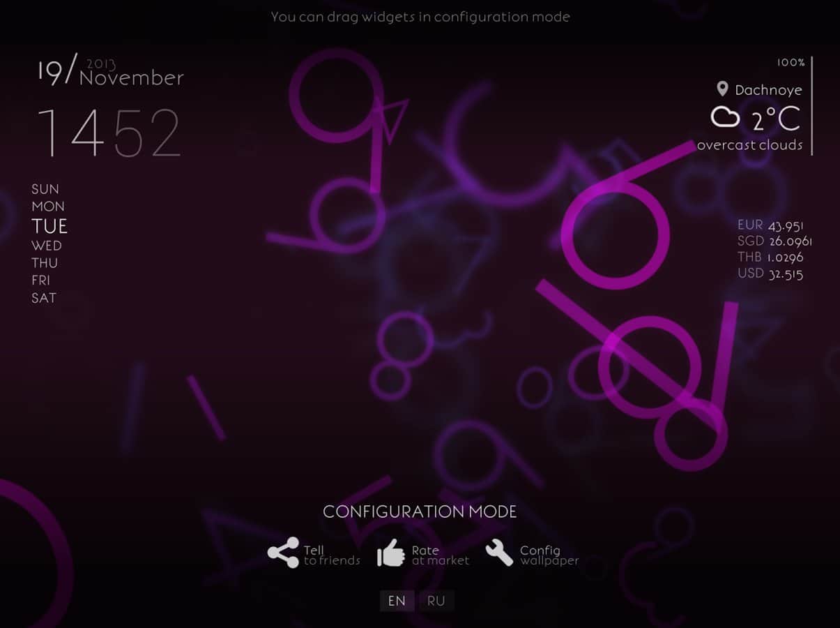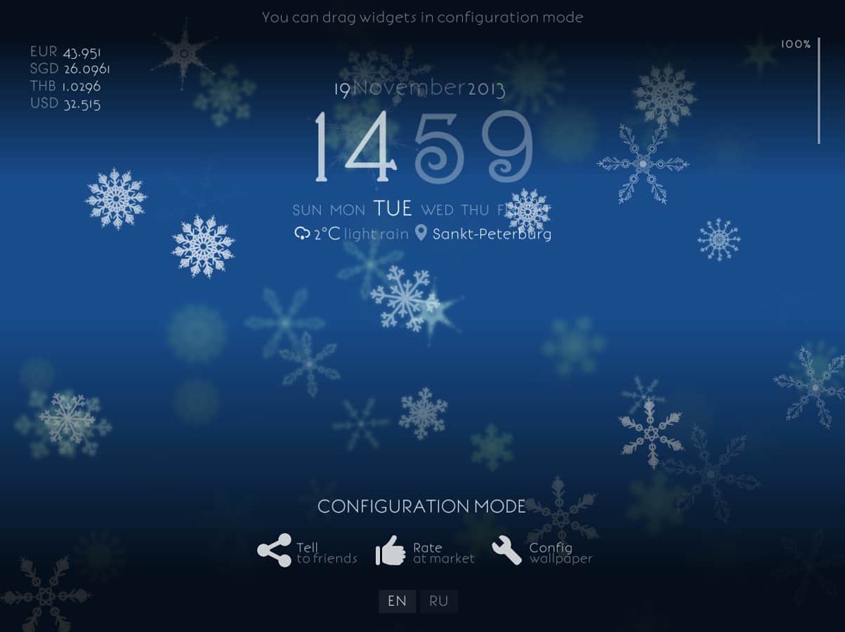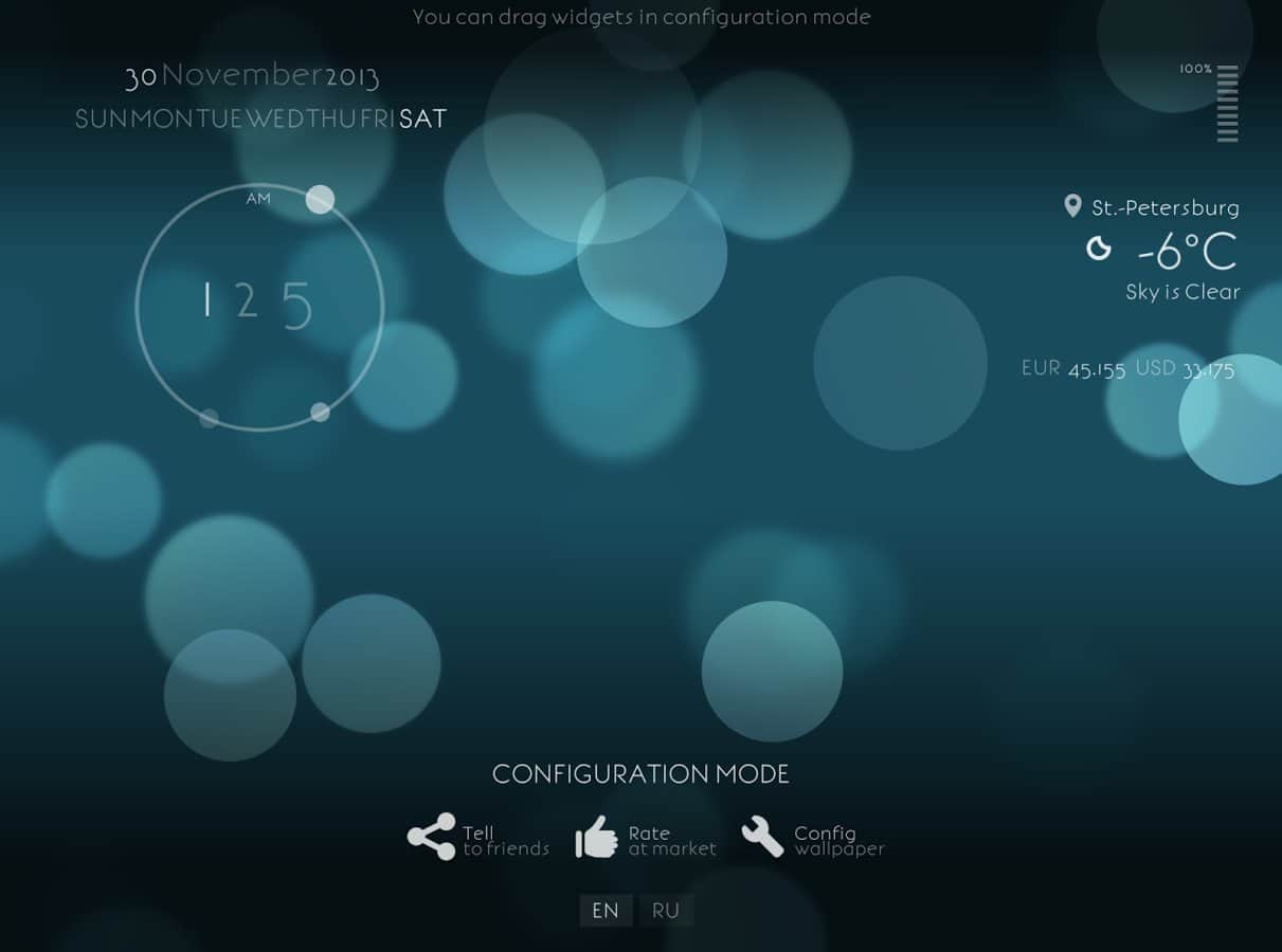 - Hava durumu tahmini, saat, gün, tarih, döviz kurları, pil durumu - ayar modunda ekranda rastgele yerleştirilebilir.