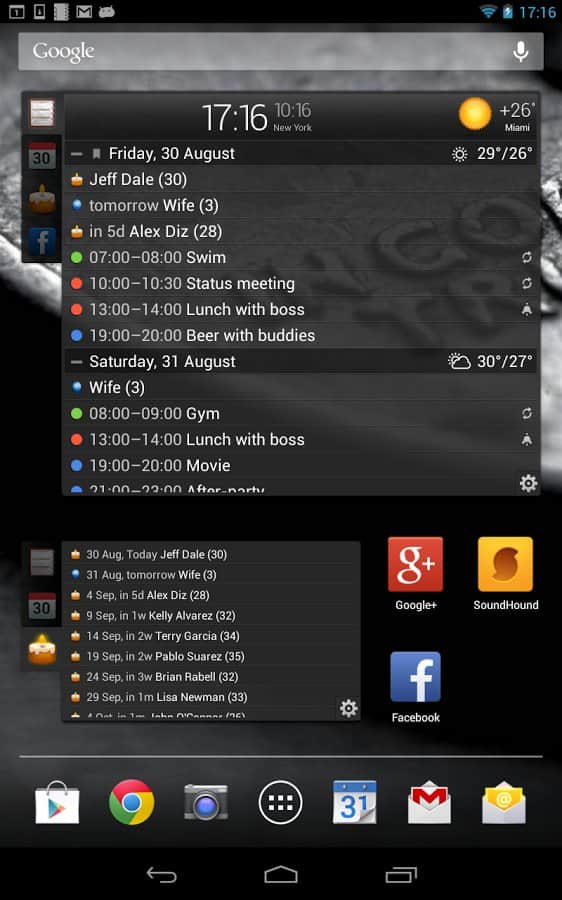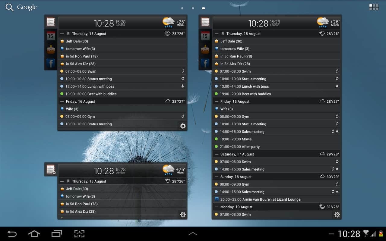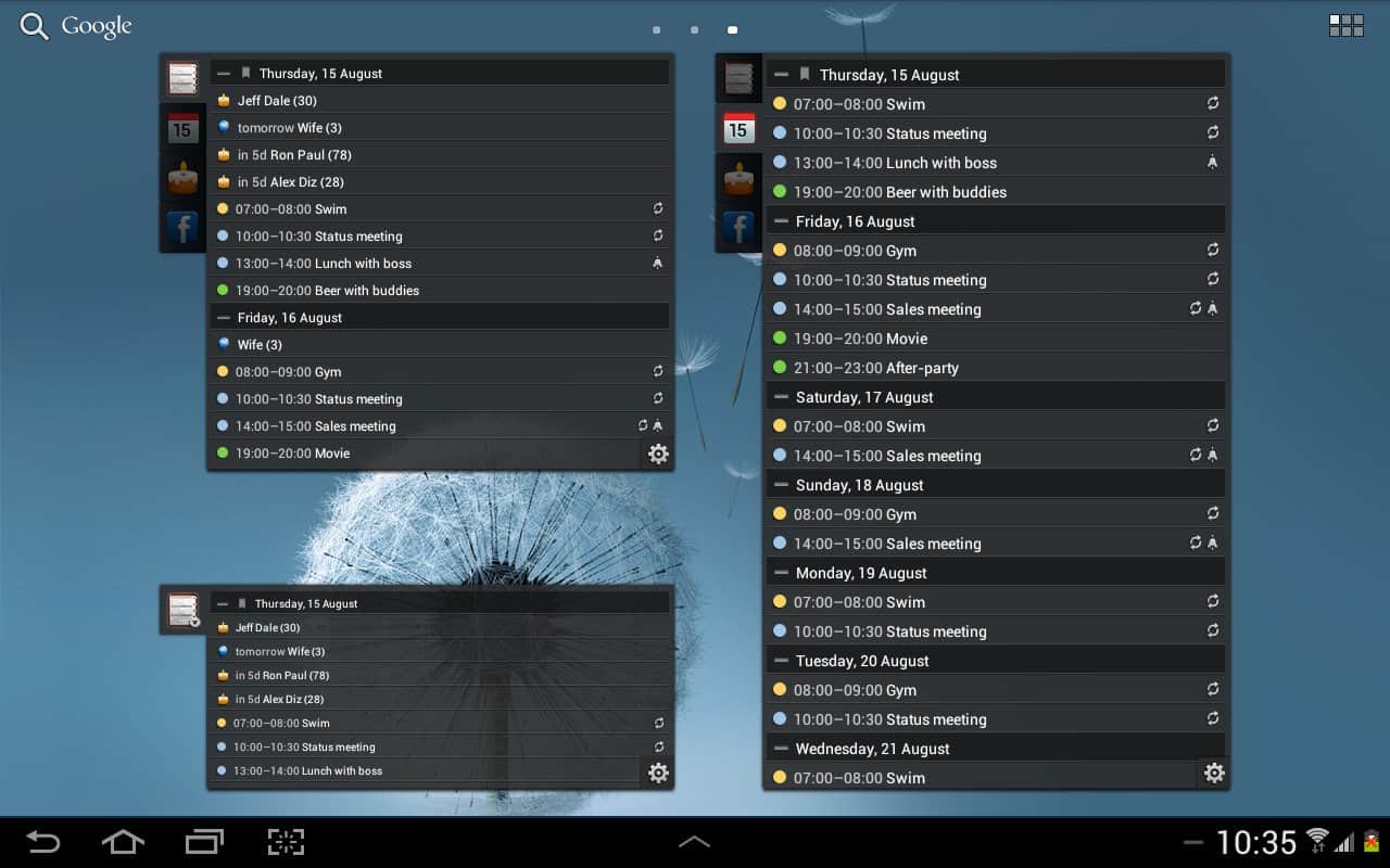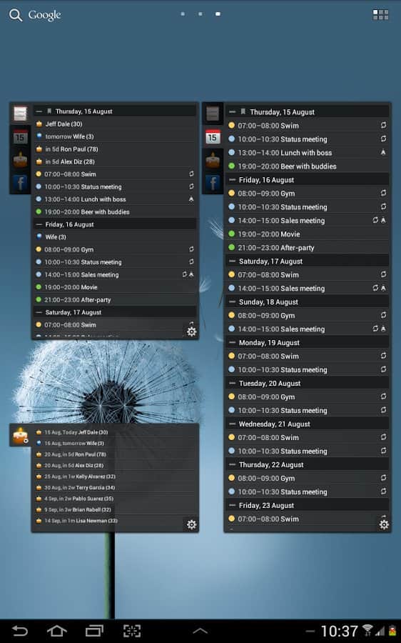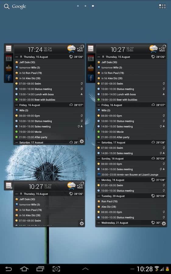 Masaüstleri çeşitli bilgi widget'larıyla dolup mu taştı? Tüm dağınık bilgileri tek bir blokta birleştirmenin bir yolu var. Burada günün takviminden alınan programı, yaklaşan doğum günlerini, Facebook'tan gelen verileri ve hava durumu tahminini bulacaksınız. Widget'tan yeni etkinlikler eklemek veya ayarlara geçmek son derece kolay. Tek olası zorluk, widget'ta kullanılan oldukça küçük yazı tipi, maksimum bilgiyi ekrana çıkarmaya olanak tanırken, görme engelli kişiler için bir engel teşkil edebilir.