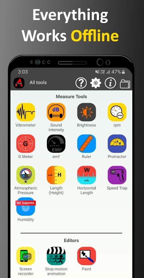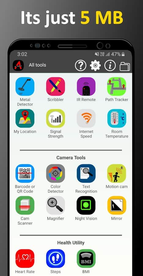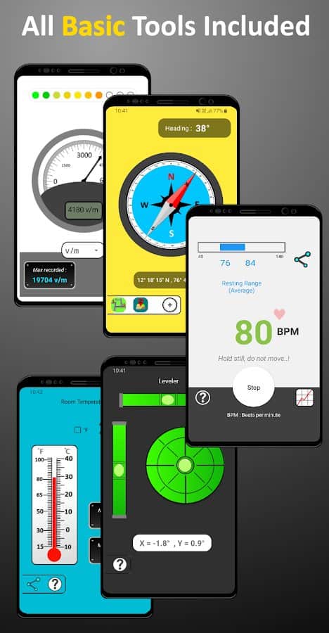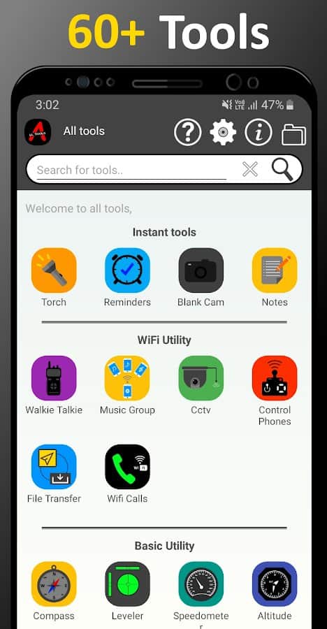 Uygulamada cihazınız için müzik, barkod ve QR kod tarayıcı, yerleşik ayna, pusula, metal dedektörü, kronometre, uzunluk, denizden yükseklik, sıcaklık ölçer, seviyeli, gönye, konum değiştirme, günlük, ses jeneratörü, kontrol cihazı, metin okuma dönüştürücüsü gibi birçok faydalı araç ve ayar derlenmiştir. Akünüzün durumu hakkında hızlıca bilgi edinin, zamanlayıcıyı kullanın, hız ölçün, metin tanıyın, dosya transferi için bir liste oluşturun, ekran kaydı yapın ve daha fazlasını gerçekleştirin. Hepsi tek bir uygulamada!