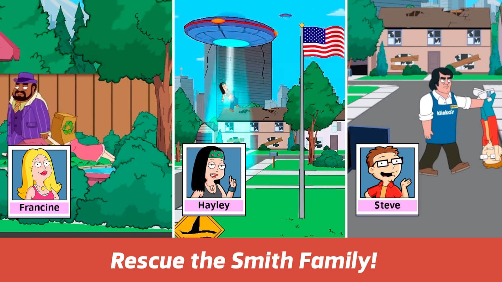 Amerikan Baba! Kıyamet Yakında – Smith ailesini uzaylılardan kurtaracağınız heyecan verici bir Android oyunu. Uzaylılar Langley Falls kasabasına saldırdı ve Stan ailesini rehine aldı. Tüm insanlığın kaderi artık sizin ellerinizde. Smith'lerin bodrumunda bir üssü inşa edin, Roger'ın klon ordusunu toplayın ve uzaylıları yenin. Sığınağınızı aşılmaz bir kaleye dönüştürün, para basın ve altın dışkıları silah ve teçhizata harcayın, bu da düşmanlarınızı yenmenize yardımcı olacak. Elinizde birçok farklı silah olacak; beyzbol sopalarından plazma tabancalarına ve elektrikli makineli tüfeklere kadar. Ordunuzu toplayın ve Amerika'yı yok olmaktan kurtarın.