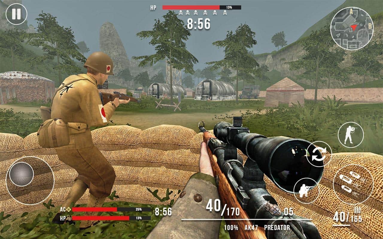 Amerikan vs Japon Keskin Nişancı - Avcı Hayatta Kalma FPS – Android için bir oyun, burada dünya savaşında askeri harekâtların bir parçası olacaksınız. Deneyimli bir askeri kontrol altına alın ve düşman üssünü yok etmeye çalışarak oyunun tüm lokasyonlarında rehberlik edin. Bu oyunda Amerikan veya Japon ordusunun tarafında oynama fırsatınız olacak. Bir keskin nişancı tüfeği alın ve düşmanı yok etmek için çeşitli savaş görevlerini yerine getirin. Düşmanlara nişan alarak ateş edin ve ödüller kazanın. Oyun, tüfeklerden el bombalarına kadar geniş bir silah yelpazesi, yüksek kaliteli grafikler ve detaylı işlenmiş unsurlarla sizi memnun edecek.