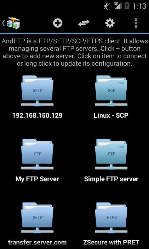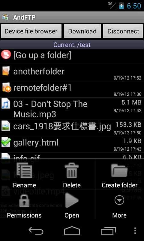 AndFTP — Android için zengin işlevselliğe sahip tam kapsamlı FTP/SFTP/FTPS istemcisi, birden fazla sunucuyu yönetmenizi sağlar. Klasör oluşturma, klasör seçme, dosyaları yeniden adlandırma ve silme, devam destekli yükleme/indirme, FTP sunucusundaki yetkilerin ayarlanması, ayrıca birden fazla FTP sunucusunu desteklemesi ve bunlar AndFTP istemcisinin sadece bir kısmı olan yeteneklerdir.