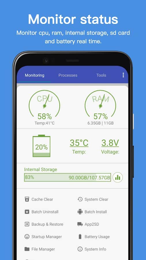 - Process Manager – renklerle kullanışlı bir şekilde ayrılmış süreç yöneticisi (widget, uygulama, sistem süreci)