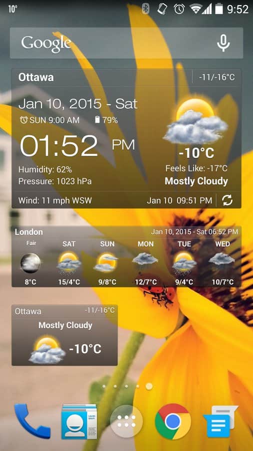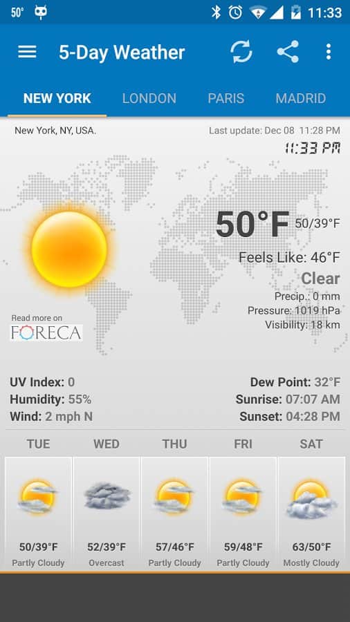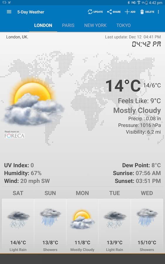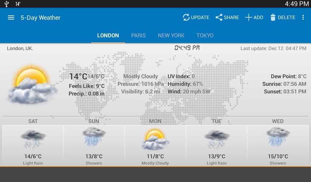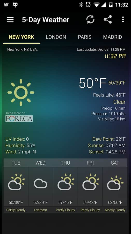 Android Hava – Devexpert.NET geliştiricilerinden Android cihazlar için bir başka hava durumu tahmini. Ücretsiz indirin, akıllı telefonunuza veya tabletinize kurun ve dünya genelinde dört günlük kesin hava durumu tahmini alın. Uygulama, ihtiyaç duyduğunuz şehri oldukça hızlı bir şekilde bulur ve nem, sıcaklık, rüzgar vb. hakkında bilgi sağlar. Android Hava, otomatik olarak (1 saat, 3 saat, 12 saat aralıklarla) veya manuel olarak güncellenebilir.