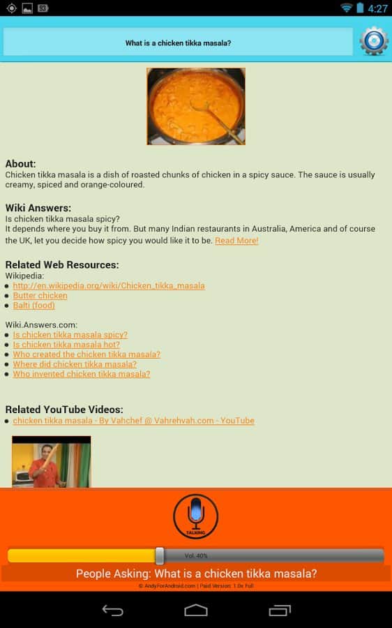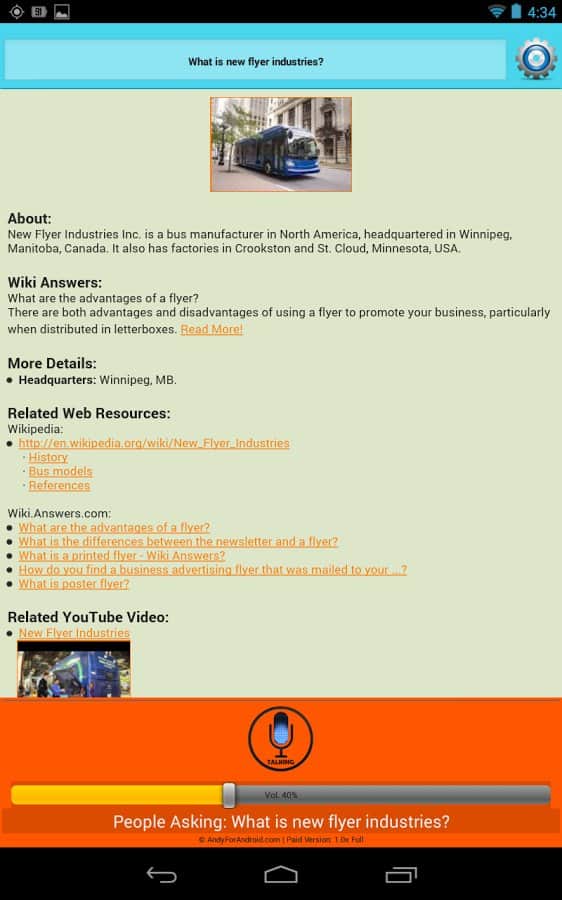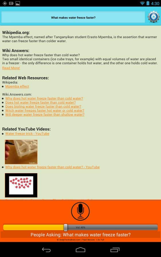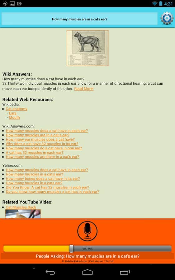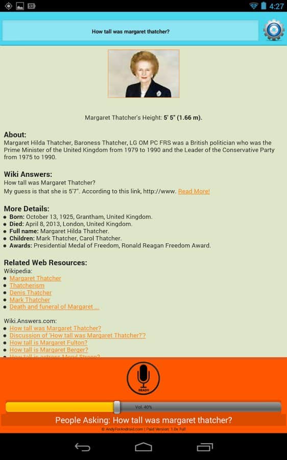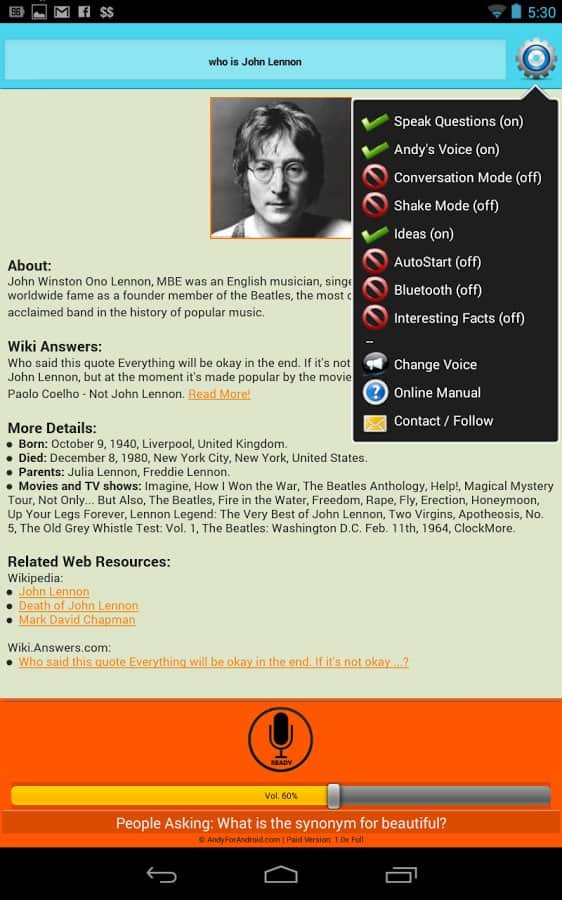 ANDY Sesli Asistan - Bu Andy, sesli asistan, Siri gibi, sadece Android için. Bu uygulama çok basit ama iyi çalışıyor. Asistanınız sadece bilgi bulmakla kalmaz, mümkünse ona bir açıklama arar ve size okumaya başlar. Eğer sesi beğenmezseniz, her zaman değiştirebilirsiniz. Ayrıca, "soru-cevap" tarzında iletişim kurabilirsiniz. Bir kişi hakkında soru sorabilir ve ardından o kişinin eğitim durumu hakkında soru sorabilirsiniz, asistanınız size bunu anlatır, bu arada kimin hakkında konuştuğunuzu yüz kere tekrarlamanıza gerek yok, bilgi hatırlanır ve bu uygulama ile diyaloğa devam edersiniz. Çok kullanışlı ve pratik, birkaç ayarı var ve oldukça memnun ediyor.