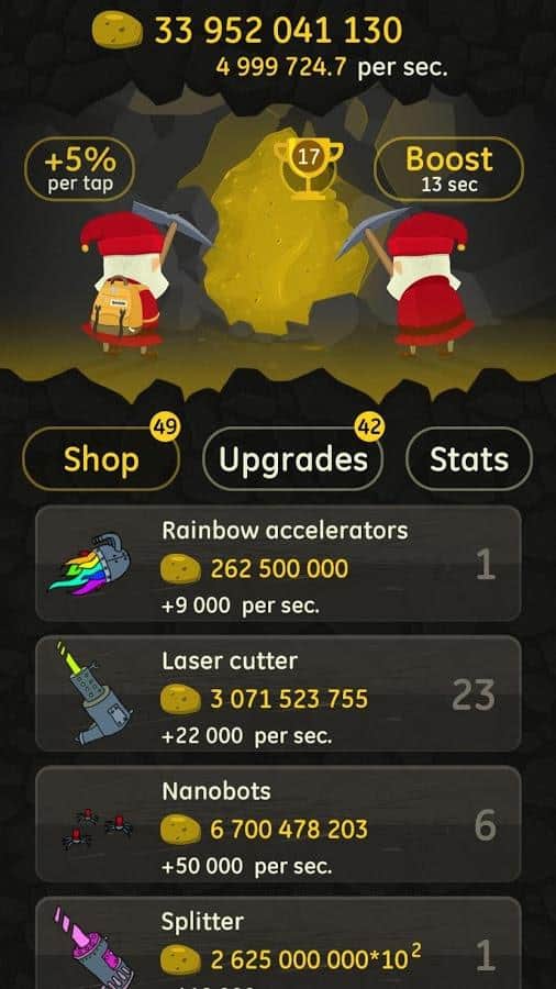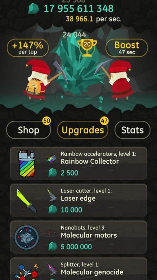 Öfkeli Tıklayıcı – Android'de harika bir mizah ve iyi grafiklerle sizi mutlu edecek bir tıklayıcı. Bu oyunda, yerin derinliklerinde yaşayan ve çeşitli madenler ile elmaslar çıkaran bir cüce ekibini yöneteceksiniz. Telefonunuzun veya tabletinizin ekranına mümkün olduğunca sık tıklayın ve taş kazmasıyla maden çıkarın. Oyun ilerledikçe kahramanınızı geliştirin ve galaktik parçalama, antimadde kondansatörü ve zaman paradoksu tanıyıcısı gibi çeşitli teknikler kullanarak işinizi ve maden çıkarımınızı iyileştirin. Oyunda 50'den fazla yükseltme seçeneği sunan çeşitli teknik satın alımları ve ayrıca 200 geliştirme bulunmaktadır. İlk elmasınızı bulmadan önce 8 çeşit maden çıkarmayı öğrenin.
