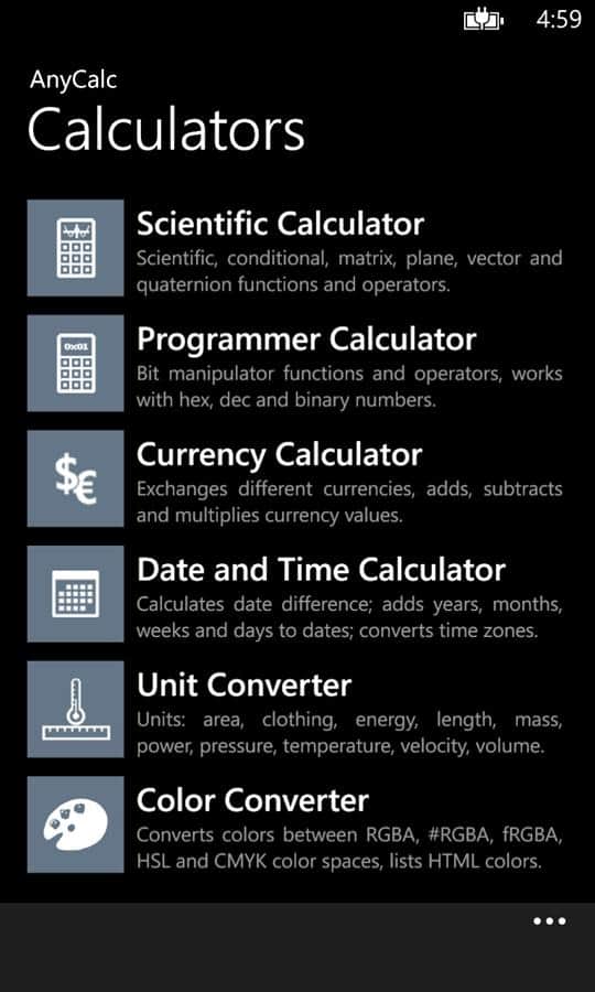 AnyCalc, Windows Phone için geliştirilmiş, karmaşık hesap makineleri sunan bir uygulamadır. Dört farklı hesap makinesi türünden oluşmaktadır: bilimsel, döviz, tarih ve zaman ile programcılar için. Tüm hesap makineleri, seyahatlerde ve günlük yaşamda faydalı olabilecek sayısız özellik içerir. Bu uygulamayı kullanın ve sınırsız olanaklarını değerlendirin.