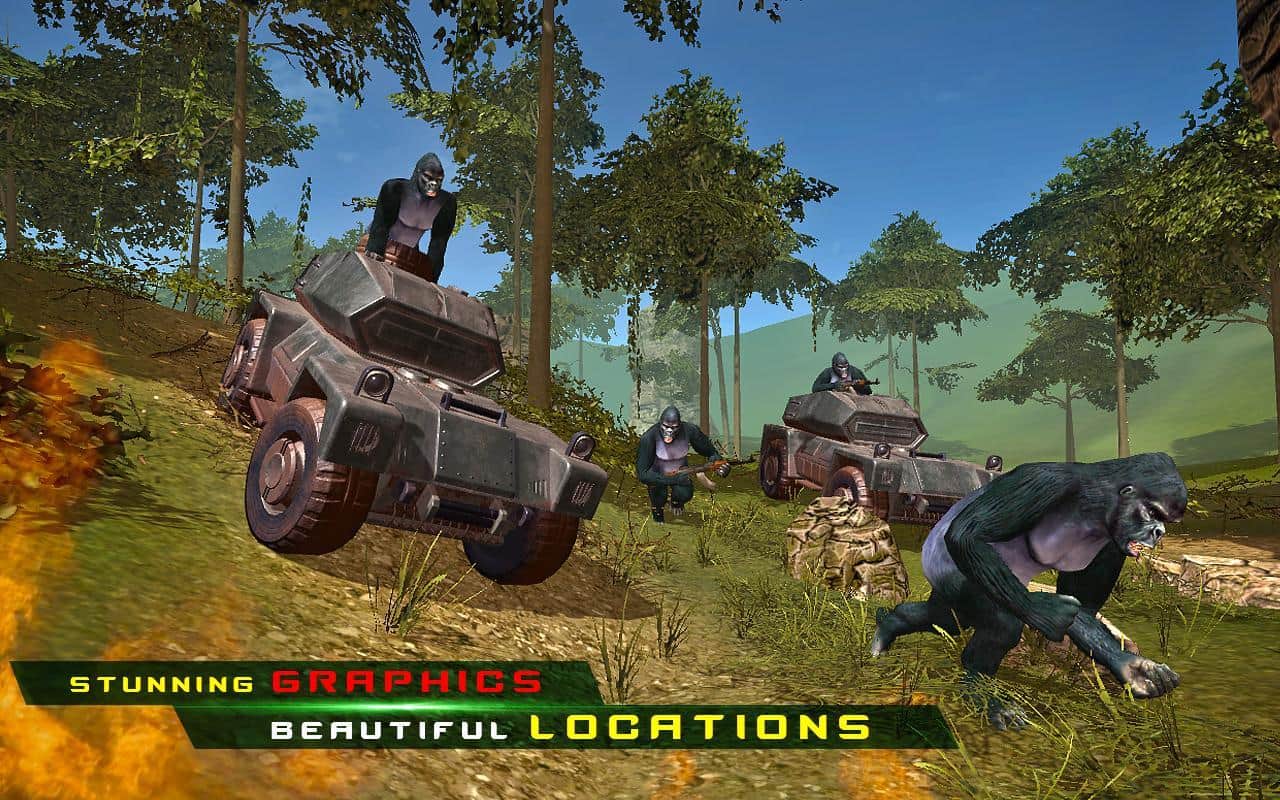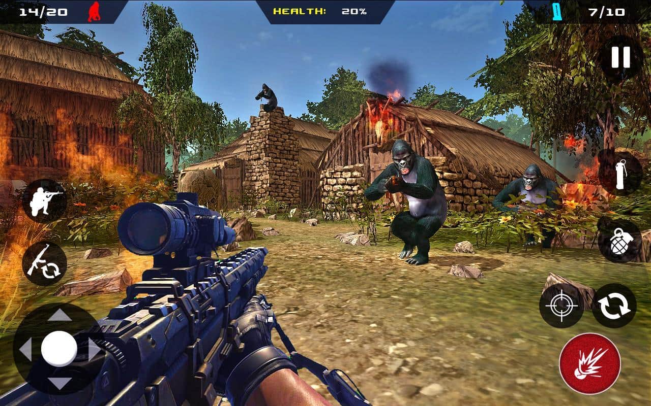 Maymun Avcısı - Orman Hayatta Kalma – Android için bir oyun, burada agresif maymunlarla dolu tropik bir adaya gideceksiniz. Bu oyunda, modern silahlarla donanmış maymunlarla karşılaşacaksınız ve onların planları dünyayı ele geçirmek ve insanlığı köleleştirmektir. Güçlü bir silah alın ve mümkün olduğunca çok maymunu yok etmek için uygun bir pozisyon alın. Hükümetin gizli görevini yerine getirin ve maymunların planlarını bozun. Adanın çeşitli yerlerinde hareket edin ve düşmana nişan alarak ateş edin, gerçek nişancılığınızı ve silah ustalığınızı gösterin. Yolunuzda çok sayıda silahlı maymunla karşılaşacaksınız.