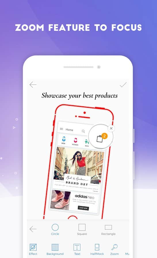 - Ekran görüntüsüne çeşitli efektler uygulama: arka plan, renk, açı, gölge, parlama, bulanıklık vb.;