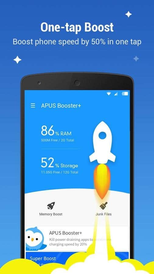 APUS Booster+Telefonu Hızlandır - Cihazınızın performansını artıracak bir başka uygulama, çok sayıda gereksiz uygulamayı kapatarak. Belleği temizlemek ve çalışmayı optimize etmek için oluşturulmuştur ve işlevini oldukça iyi yerine getirir. İşlemci üzerindeki yük nedeniyle, akıllı telefonunuz ısınmaya başlayacaktır, bu nedenle bu uygulama sadece yükü azaltmakla kalmaz, aynı zamanda işlemcinizin sıcaklığını ekrana getirir, böylece onu asla aşırı ısıtmaz ve böylece maksimum çalışma süresini azaltmazsınız.