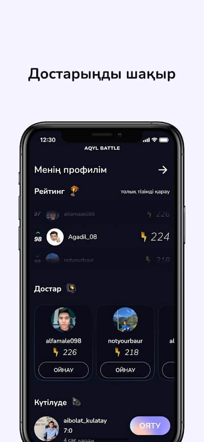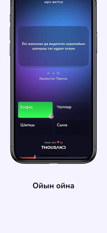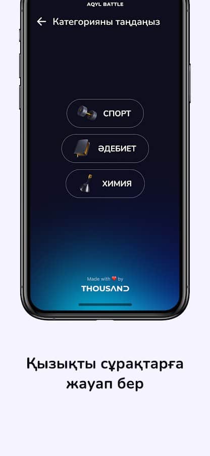 Bir bilgi yarışmasına katılın ve uygulamadaki diğer kullanıcılar arasında en aktif oyunculardan biri olun! Yeni bir profil açarak, şu anda sunulan sorulara yanıt vermeye başlayabilirsiniz. İlginç süreç sayesinde, seçtiğiniz kategorilerde (matematik, coğrafya, Kazakça, Kazak edebiyatı, biyoloji, kimya, dünya tarihi, Kazakistan tarihi, dünya haberleri, tıp, bilim-bilgi, müzik, kültür ve daha fazlası) büyük miktarda yeni bilgi edinme fırsatına sahip olacaksınız!