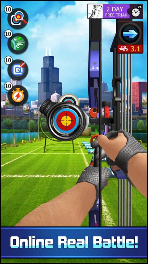 Okçuluk Yay – Android için bir spor oyunu, burada farklı hedeflere ok atacaksınız. Oyunda, gerçek oyuncularla rekabet edebileceğiniz yeni bir oyun modu bulacaksınız ve okçuluk becerilerinizi göstereceksiniz. Farklı mekanlarda hareket edin ve hava balonlarına, hediye kutularına ve şişelere nişan alın. Yüksek çözünürlüklü harika 3D grafiğin tadını çıkarın ve yeni yaylar keşfedin. Dünyanın dört bir yanındaki gerçek oyunculara meydan okuyun ve onlarla nişan alma ve atış doğruluğunuzu gösterin. Oyun, çeşitli hava koşullarının son sonucu etkileyeceği gerçekçi bir fizik ile sizi mutlu edecek. Bu oyunda sizi 12'den fazla yay, 6 eşsiz manzara, 150 görev ve 4 atış modu bekliyor.