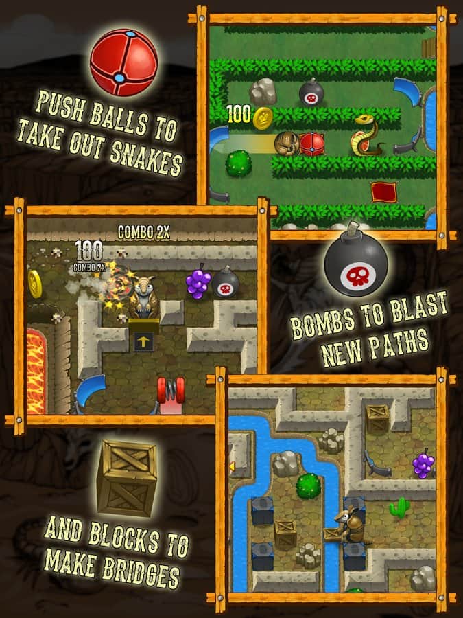 Armadillo Altın Koşusu - Altın madenciliği artık çok yakın ve ana karakterimiz başını altın toplamaya gömdü. Olabildiğince fazla altın toplamalı ve önündeki tüm tehlikelerden kaçınmalıdır. Armadillo'nun bir özelliği var, eğer ileri doğru yuvarlanmaya başladıysa, onu durduracak tek şey bir duvar. Bu da demek oluyor ki, hamlelerinizi iyi düşünmelisiniz, yoksa bir çıkmaza girebilirsiniz. Ayrıca, her tamamladığınız seviye için puan kazanacaksınız, bu puan miktarı ne kadar çok altın topladığınıza veya seviyeyi ne kadar hızlı geçtiğinize bağlı.
