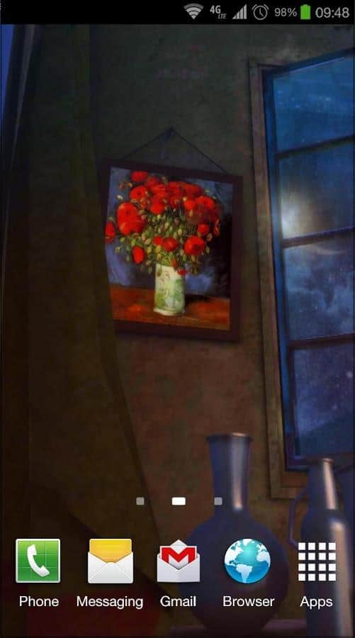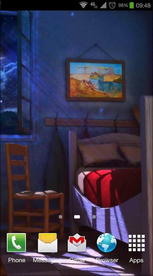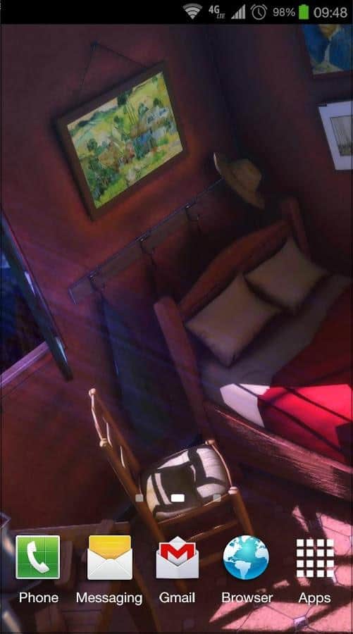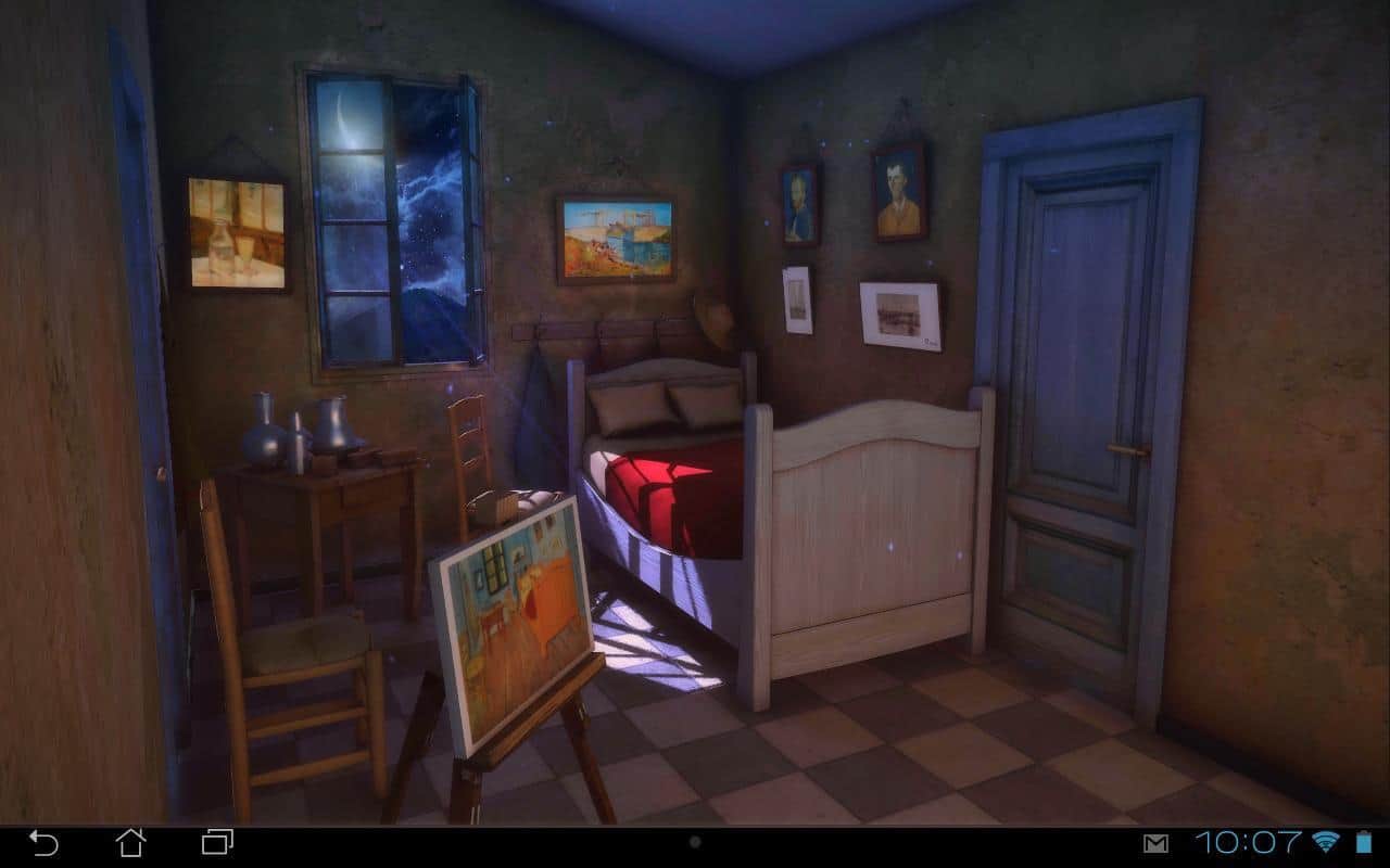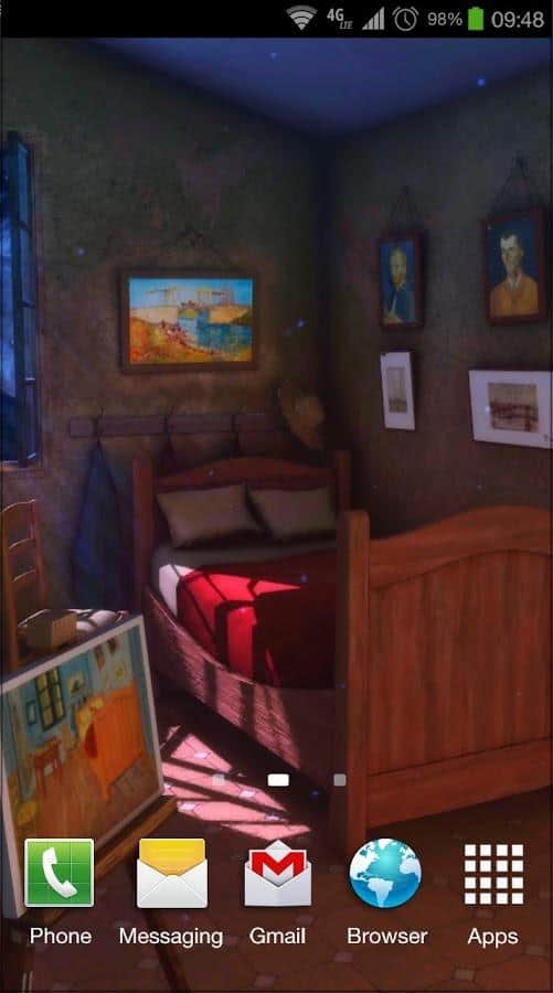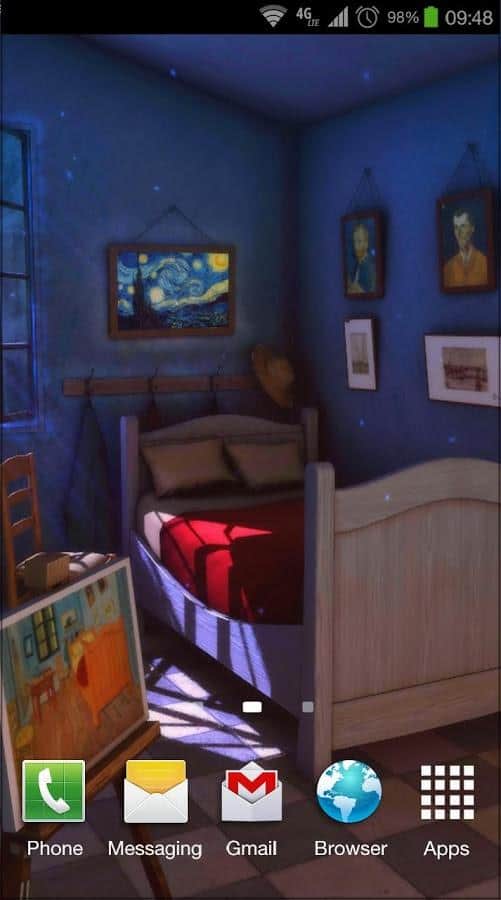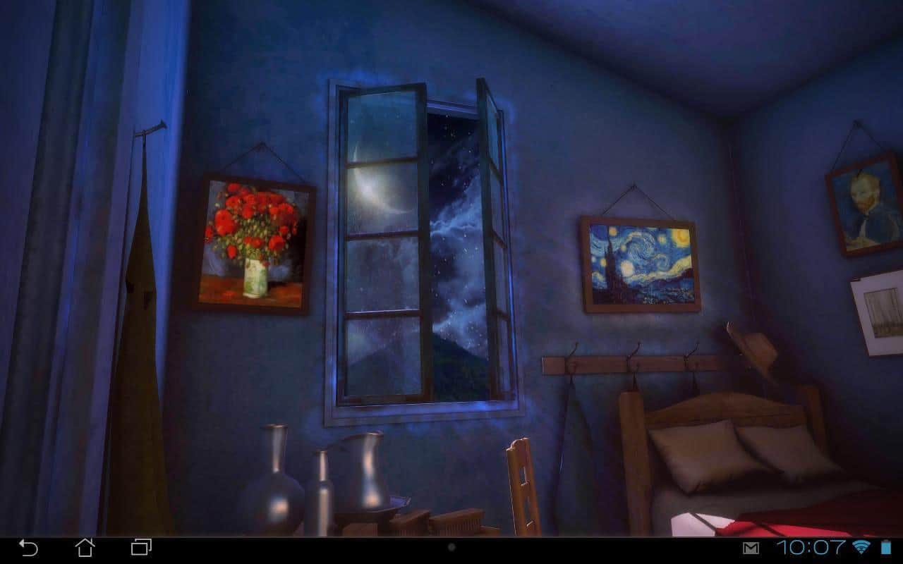 Sanat Canlı: Gece 3D – Van Gogh'un ünlü tablosu 'Arles'deki Yatak Odası'na göre yapılmış canlı duvar kağıtları. Bu duvar kağıtları sayesinde kendinizi resmedilmiş yatak odasında gibi hissedeceksiniz. Kamerayı döndürün ve odadaki tüm detayları görün. Bu duvar kağıtları size 10 resim ve 9 kamera açısıyla keyif verecek. Gerçek sanata dalın ve ayarlamalarla odadaki tabloları, duvarları, zeminleri ve kapıları değiştirerek ünlü sanatçının resmettiği odaya kendi dokunuşunuzu katın. Bu canlı duvar kağıtlarını telefonunuza veya tabletinize yükleyin ve gerçek sanata biraz daha yakınlaşarak tadını çıkarın.