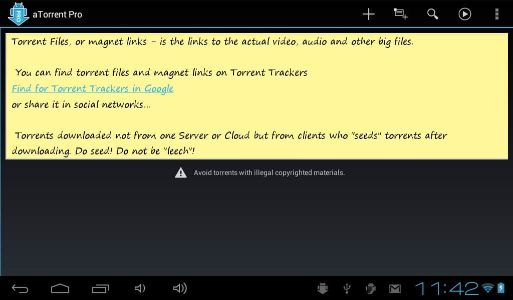 aTorrent PRO Android'de – BitTorrent programı. Gerekli tüm özellikleri içeren iyi bir torrent istemcisi. aTorrent PRO'yu indirin, kurun ve dosyaları akıllı telefonunuza veya tabletinize kolayca indirin!