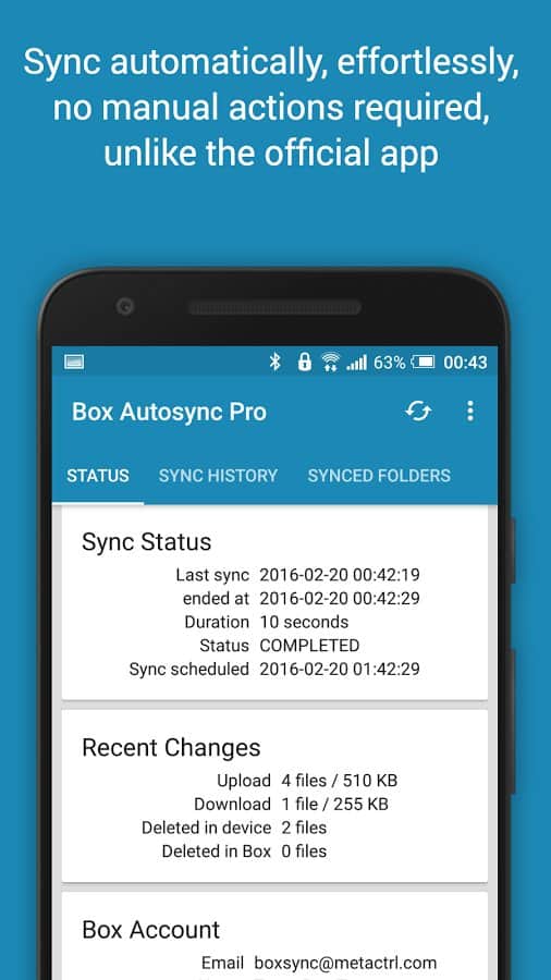 Otomatik Kutu Senkronizasyonu – cihazınızın Box.net ile tam iki yönlü senkronizasyonunu sağlamak için bir uygulamadır. MetaCtrl tarafından geliştirilen bu uygulama, her zaman istikrarlı bir çalışma ve düşük pil tüketimi vaat eder. Ayrıca, aşağıdaki gibi birçok özelliğe sahiptir:
