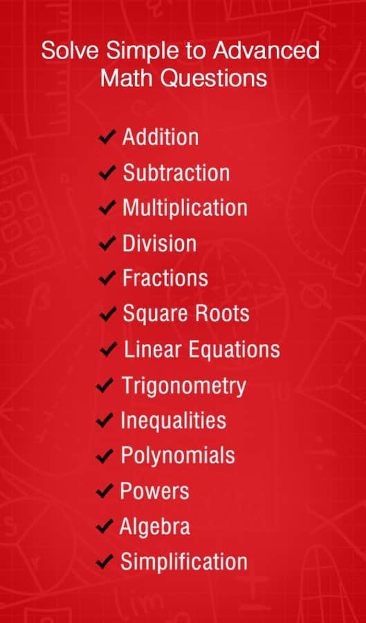 - Basit ve karmaşık örneklerin çözümleri (toplama, çıkarma, çarpma, kesirler, bölme, eşitsizlikler, karekökler, trigonometrik ifadeler, denklemler, çokgenlerin sadeleştirilmesi vb.)