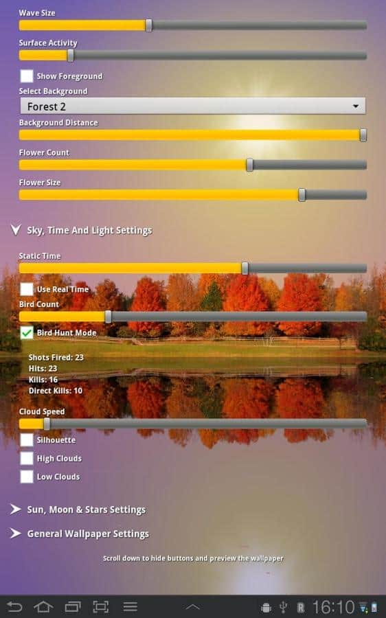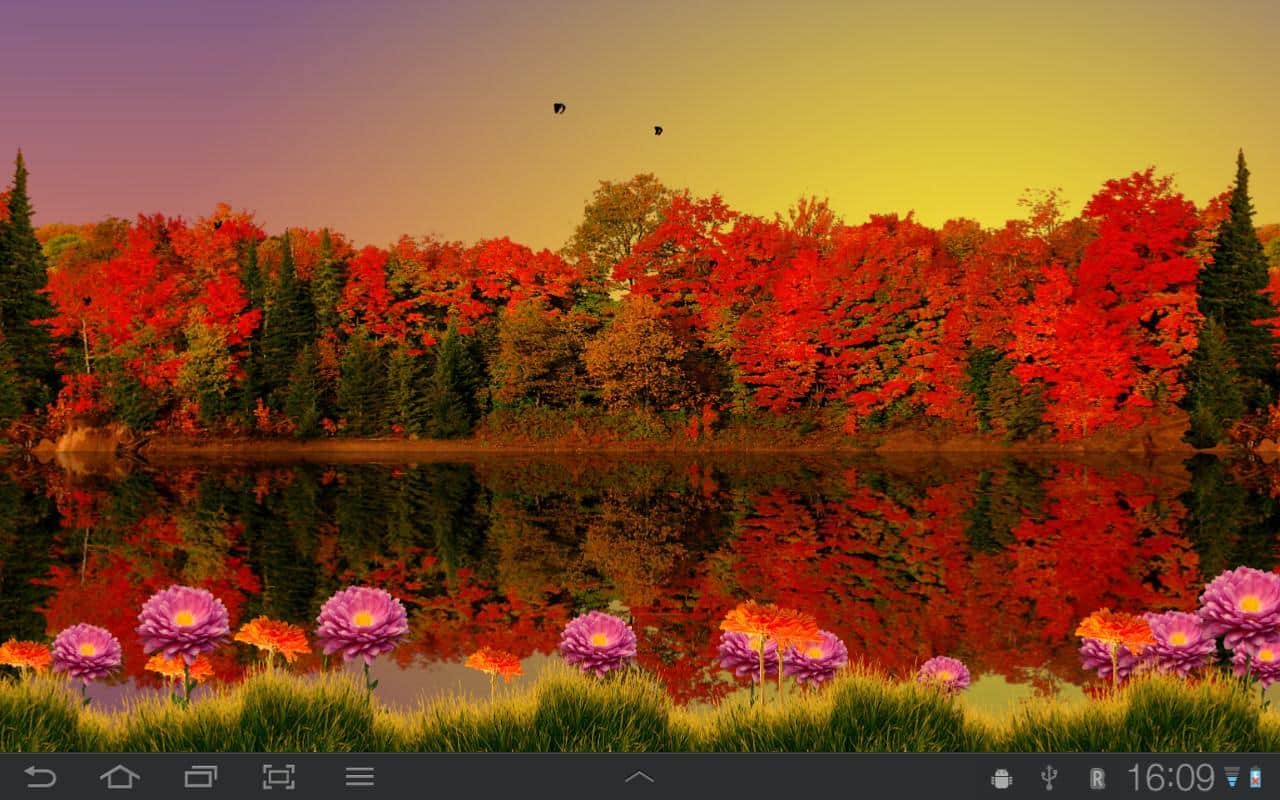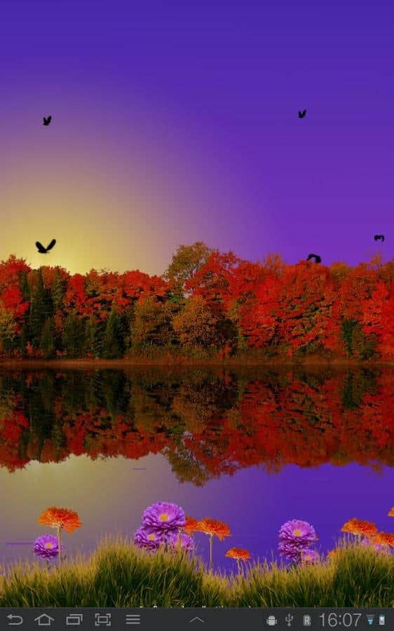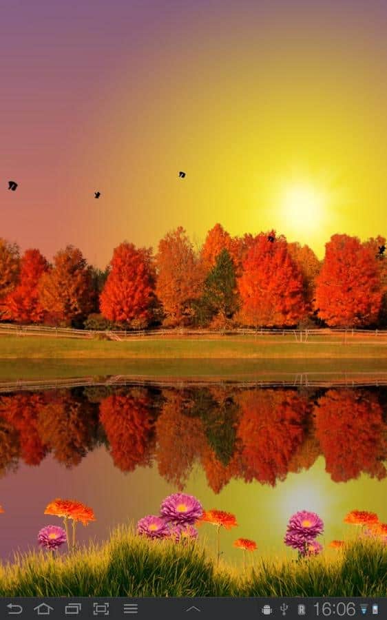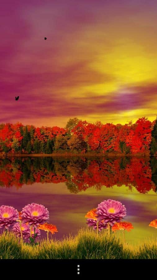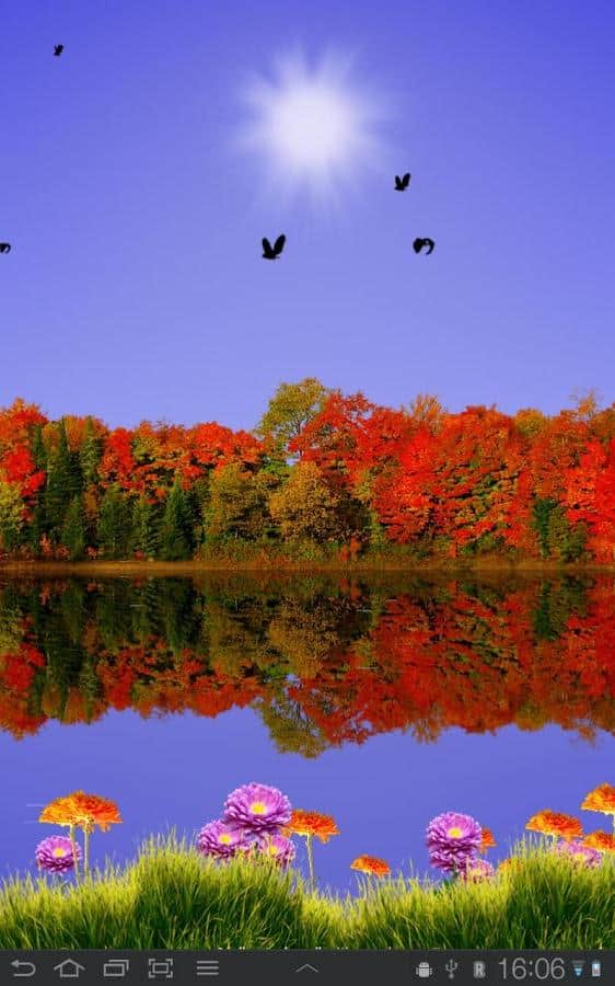 Sonbahar Gölü Canlı Duvar Kağıdı - gelen sonbahar, canlı renkler ve artık serin göl suyu ile Android için harika canlı duvar kağıtları. Bu olağanüstü güzel duvar kağıtlarını akıllı telefonunuzun ekranına kurun ve gökyüzünde yüzen bulutlar, günün saatine bağlı olarak yer değiştiren güneş ve ay ile mutlu olun. Uçuşan kuşlar, soğuk suda yansıyan renkli ağaçlar ve hala açan çiçeklerle (ön planda) sonbahar atmosferi, doğadaki değişimlerin başlangıcına gizem ve zarafet katıyor!