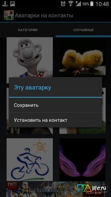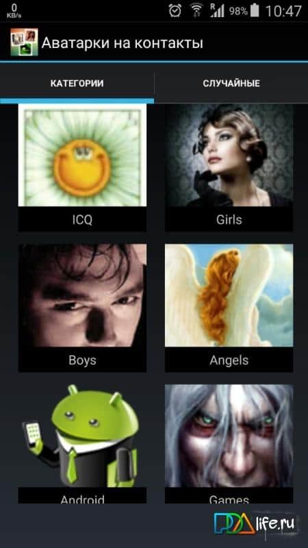 Avatar, bu kelimenin modern anlamında, ağdaki görüntümüzdür; bu nedenle, seçimimize bu kadar çok zaman ve dikkat ayırıyoruz. İnternetteki sayısız resmi ve kendi fotoğraflarımızı karıştırmak zorunda kalmamak için, bu uygulamayı yüklemek yeterlidir. Bu uygulama, avatar olarak kullanılmak üzere uyarlanmış geniş bir görüntü koleksiyonuna erişim sağlar (görüntü boyutları 110x110 piksel). Mevcut tüm resimler tematik kategorilere ayrılmıştır ve ne seçeceğinizi bilmiyorsanız, rastgele seçim yapabilirsiniz. Beğendiğiniz resimleri ya kaydedip sonra kullanabilir ya da hemen akıllı telefonunuzda kaydedilmiş kişilere ayarlayabilirsiniz.