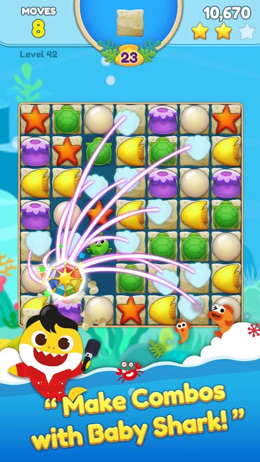 Baby Shark Eşleştirme: Okyanus Partisi – deniz tabanında yer alacağınız ve birçok deniz canlısı ile tanışacağınız eşleştirme oyunu. Bu oyundaki ana hedefiniz, üç veya daha fazla nesneden oluşan sıralar oluşturarak boş zamanınızı eğlenceli bir şekilde geçirmektir. Meduzalar, deniz yıldızları, kaplumbağalar ve balıklar ile sıralar oluşturarak harika ödüller ve bonuslar kazanın. Oyunun beş farklı modunu deneyin ve oyun stilinize en uygun olanı seçin. Mümkün olduğunca çok hazine toplayın ve yeni arkadaşlarınızı açın.