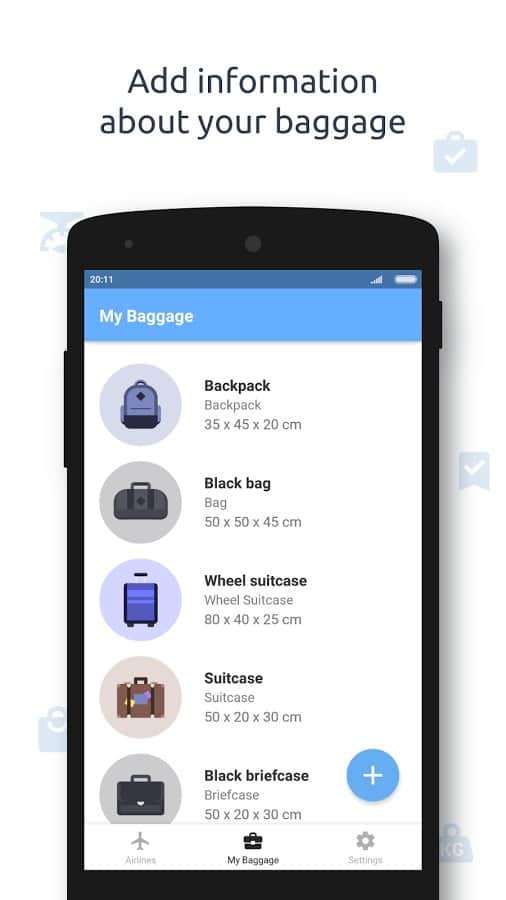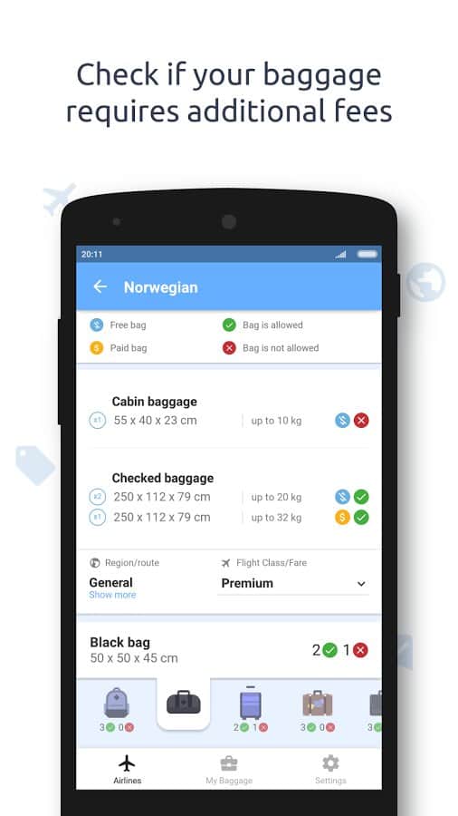 Baggify - havayolu bagaj hakkı - uygulama, çantanızın boyutunun belirli bir sınıftaki uçuştan ücretsiz olarak taşınmaya uygun olup olmadığını öğrenmenizi sağlar. Ayrıca, kaç çantayı ücretsiz taşıyabileceğinizi ve bagajınız normlara uymuyorsa ne kadar ödemeniz gerektiğini kolayca öğrenebilirsiniz. Program, sıklıkla kullandığımız en tanınmış havayollarından bilgi alır. 7/24 müşteri hizmetleri, uçuşla ilgili tüm sorularınıza hızlı bir şekilde yanıt verecek ve mevcut değilse havayolunuzu uygulama listesine ekleyecektir.