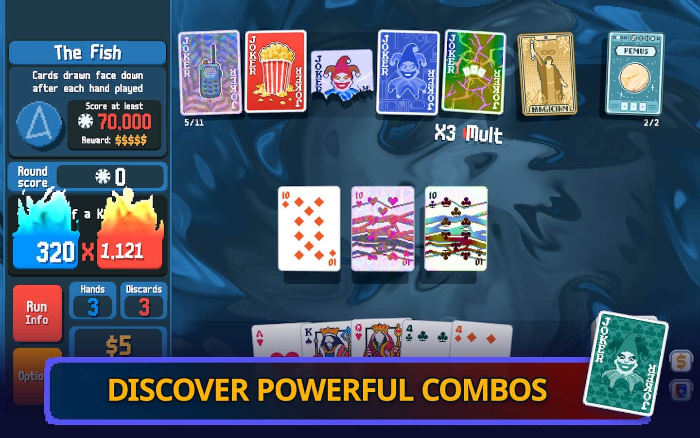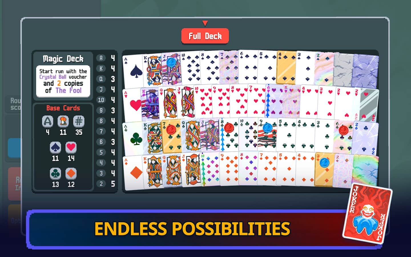 Balatro'nun resmi mobil oyununa hoş geldiniz! Göreviniz güçlü poker kombinasyonları toplayarak kör bossu yenmek. Oyunun seyrini değiştirecek yeni jokerler açın ve etkileyici kombinasyonlar oluşturun! Güçlü bossları yenmek için yeterince jeton kazanın ve oyun süresince gizli bonus kombinasyonları ve desteleri bulun. Balatro oyununa katılın ve sunduğu strateji ve eğlence zenginliğini deneyimleyin!