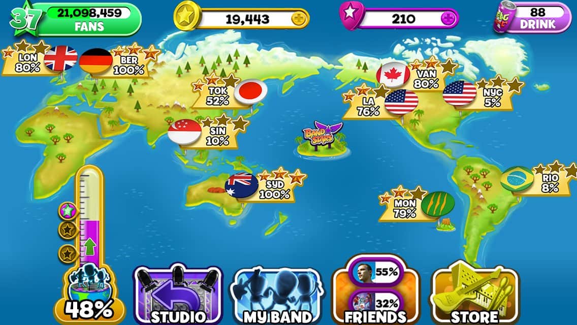 Bant Yıldızları - oyunlarda müzik grubunun prodüktörü rolünde yer alıyorsunuz. Müzisyenlerinizi eğitin, görevleri tamamlayın ve yeni bir hit kaydetmek için stüdyoya gidin, böylece hit listelerine girebilirsiniz. Dünya çapında şöhret kazanın ve ulusal ve uluslararası zirvelere tırmanın! Sizi şöhret ve zenginlik bekliyor!