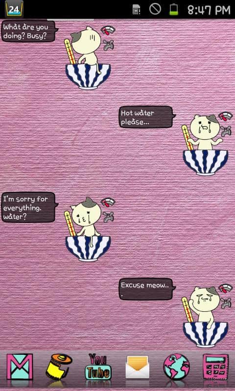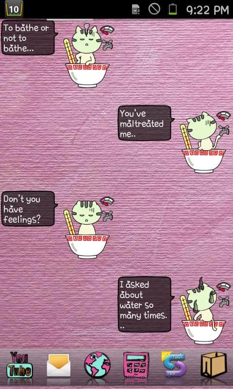 Banyo Kedisi – Espier Studio'dan çok karakteristik bir "tamagotchi" kedi ile Android için eğlenceli bir pil widget’ıdır. Yüzmeyi seven kedi, pilin şarj durumu hakkında sizi bilgilendirecek; burada su seviyesi pilin şarj seviyesine eşittir ve suyun sıcaklığı pilin sıcaklığına eşittir. Özelleştirme olanakları arasında arka plan, banyo ve kedinin resmini değiştirme bulunuyor. Banyodaki suyun sıcaklığı ne kadar düşükse, kedi o kadar huysuzlaşıyor.
