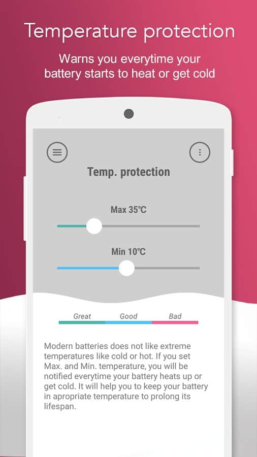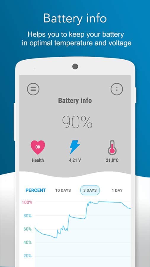 Pil Ömrü Uzatıcı - Pilinizi iyi durumda tutmak için tek bir basit uygulama ile. Pilin maksimum şarj ve deşarjı onu bozabilir, ayrıca pek az kişi bilmektedir ki pilin de çalışma modları vardır. Bu modlar, bu uygulama aracılığıyla manuel olarak kontrol edilebilir, pilin performansını takip edebilir ve aşırı ısınmasını engelleyebilirsiniz. Uygulamamız, pilin şarj seviyesinin ve sıcaklığının genel bir görünümünü sağlar