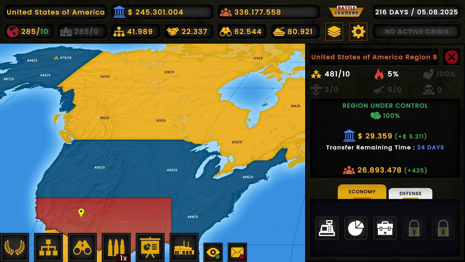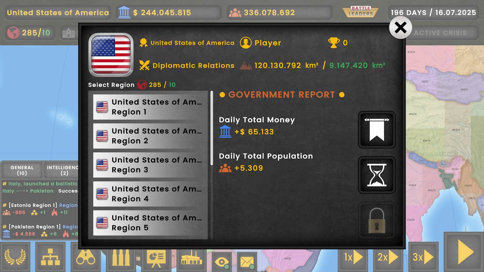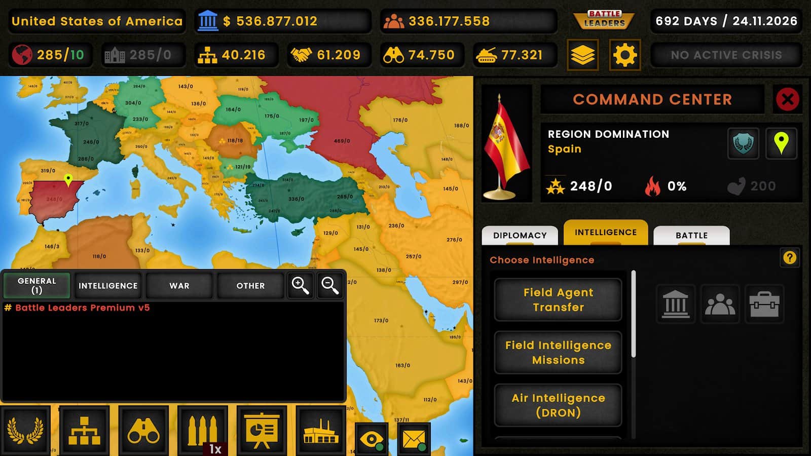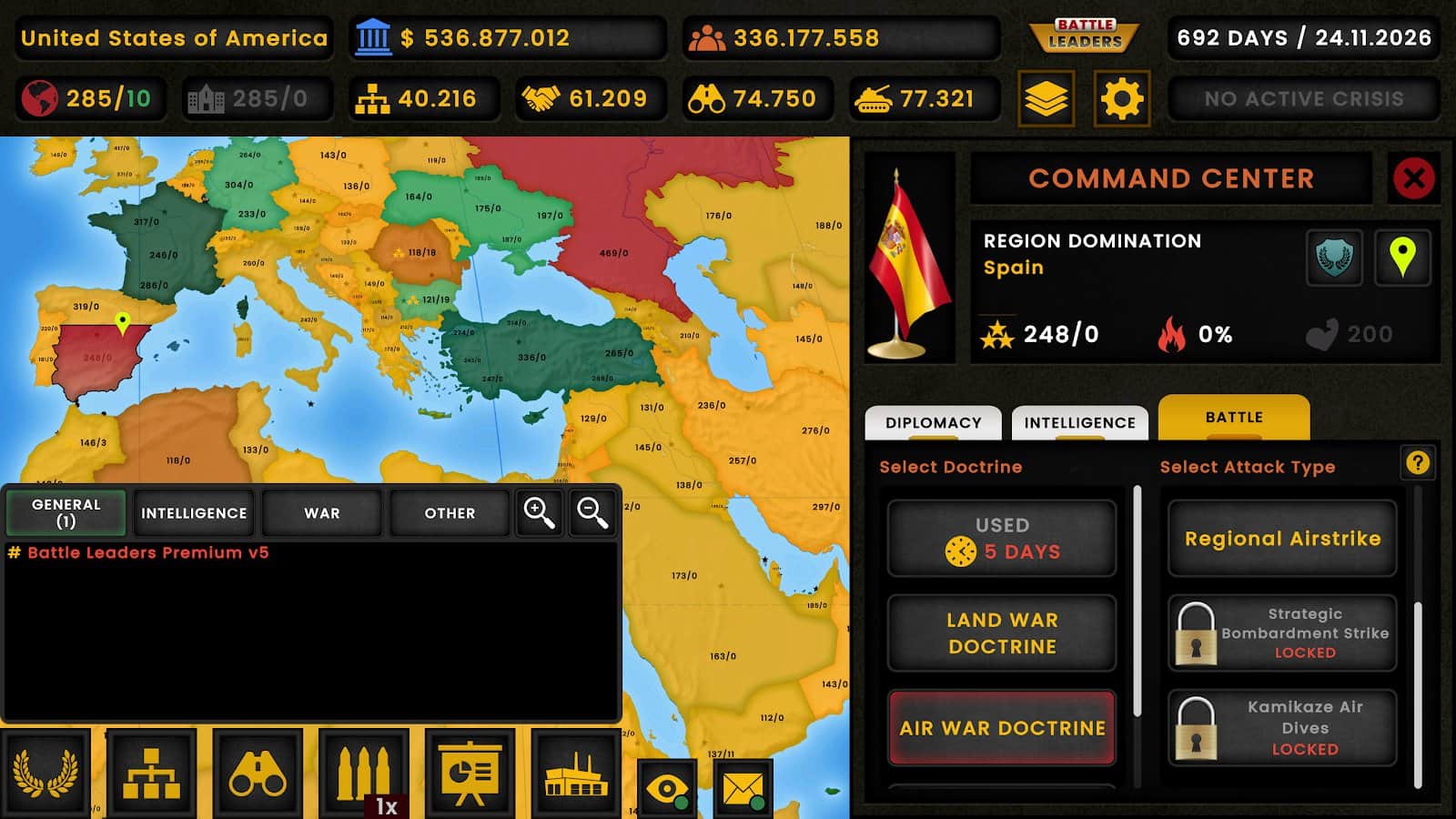 Savaş Liderleri Premium - Android için bir strateji oyunu, burada seçtiğiniz ülkenin yöneticisi olmanız, onu geliştirmeniz ve düşman devletleri ele geçirmeniz gerekecek. Diğer ülkeler hakkında bilgi toplamak için istihbarat merkezi kullanın. İnsansız hava araçları, helikopterler ve keşif uçaklarıyla gelişmiş istihbarat raporları toplayın. Farklı askeri doktrinler kullanarak çeşitli saldırılar düzenleyin. Balistik füzeler, insansız hava araçları, savaş uçakları ve bombardıman uçaklarıyla stratejik hedefleri yok edin.