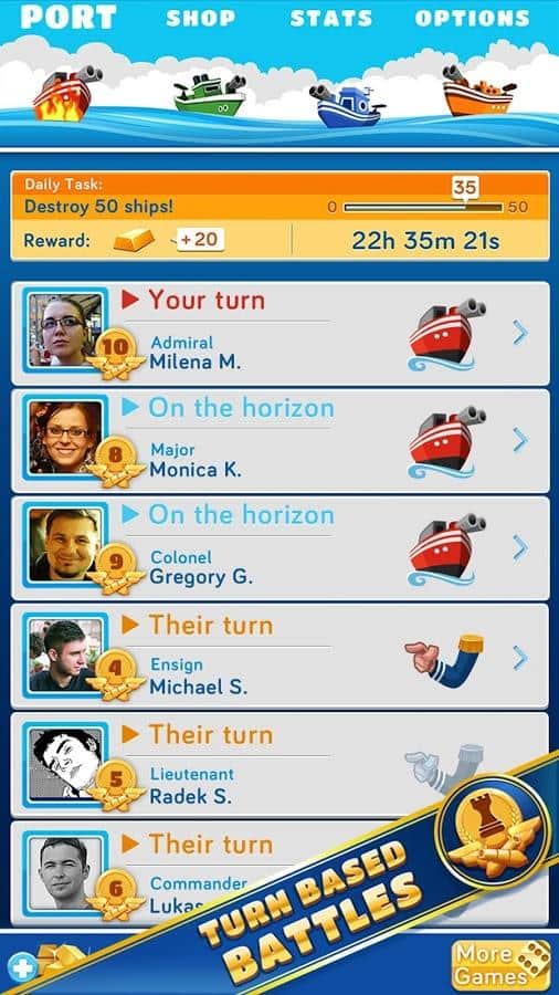 BattleFriends at Sea - bu eski dost deniz savaşı Android için. Oyun çoklu platformda, Facebook'taki arkadaşlarınızla oynayabilirsiniz. Oyunda güzel 3D grafikleri var. Oyunda birçok rakip var, rakip bulmak için uzun süre beklemenize gerek kalmayacak.