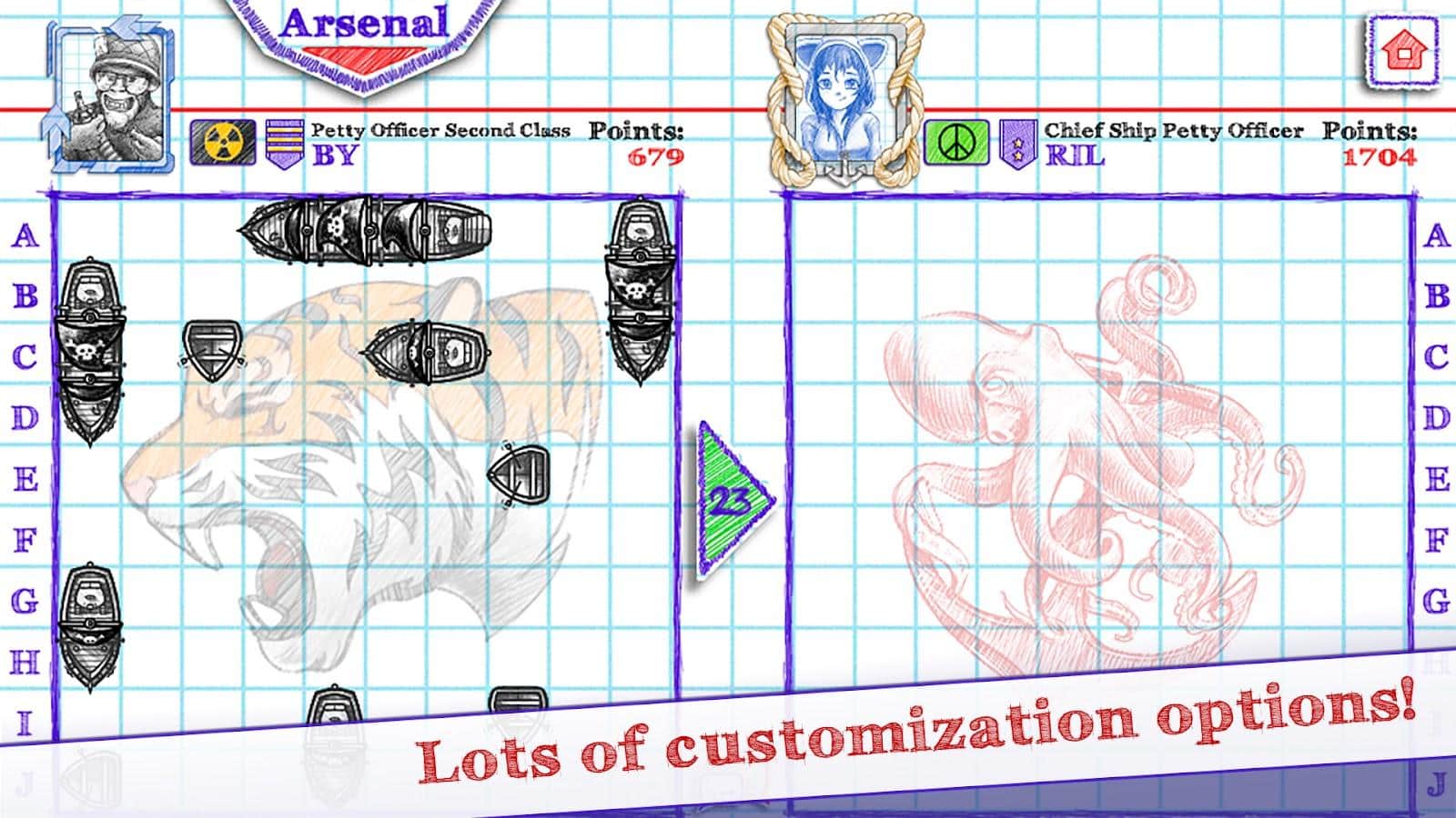 Deniz Savaşı 2 Android için – kağıt stratejisinin devamı. Bu sefer yalnızca Bluetooth üzerinden iki kişi değil, dünya genelindeki oyuncularla çevrimiçi de oynama imkanı var. Seçiminize göre bir dizi savaş aracı mevcut: uçaklar, gemiler, bombardıman uçakları, mayınlar ve daha fazlası. Kare alanda savaş araçlarınızı yerleştirin, düşmanınıza ateş edin ve kendi aracınızın yok olmasına izin vermeyin.