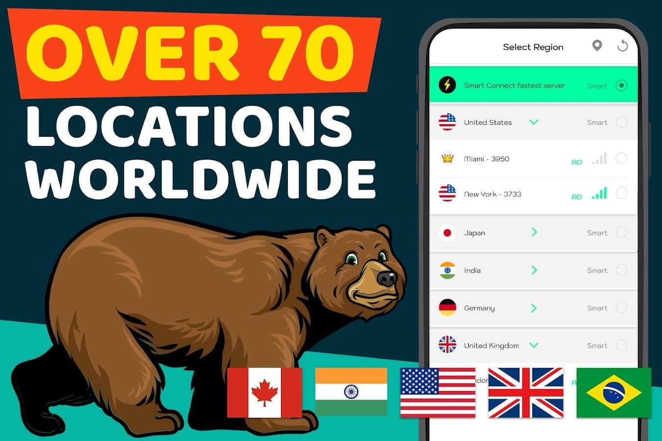 Bear VPN - 70'den fazla ülke, IP adresinizi değiştirerek size yeni bir konum sunmaya hazır! Farklı sunuculara tamamen ücretsiz olarak bağlanmayı deneyin ve internet üzerindeki imkanlarınızı genişletmenin tadını çıkarın. VPN, birçok durumda mükemmel bir şekilde yardımcı olur: bazı ülkelerin kısıtlamalarından kaçınma, ülkenizde belirli uygulamalara veya müziklere erişim sağlama, bilgi indirme hızını artırma ve diğer faydalı işlevler. Tek yapmanız gereken uygulamayı indirmek, gerekli ülkeye tıklamak ve bağlantıyı beklemektir.