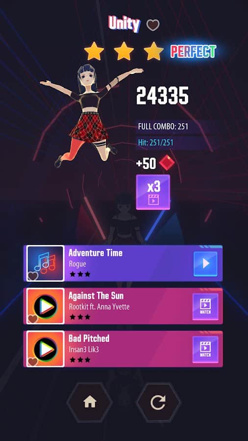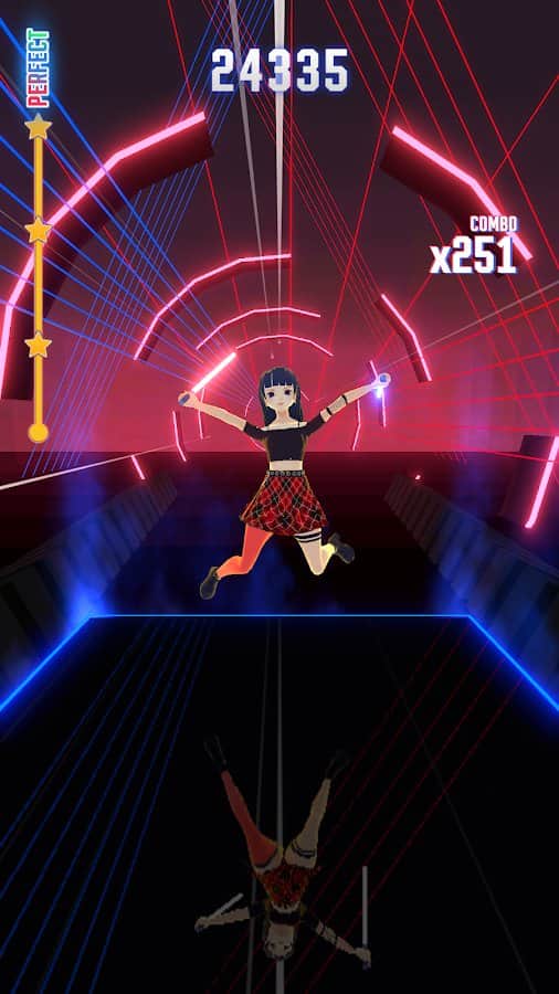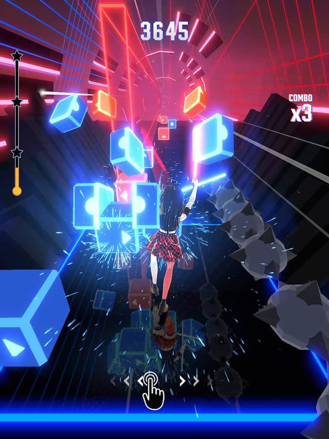 Müzikal ritim oyunu, görevinizin ritme uygun olarak vuruşları kırmak ve küp ve çubuk şeklindeki engelleri aşmak olduğu bir oyundur. Sevimli bir kahraman ve neon aydınlatma, seviyeleri geçmeyi rahatlatıcı ve keyifli hale getiriyor. Oyunda, şarkıları söyleyerek ve ritme uyarak çalabileceğiniz birçok parça mevcut. Oyunun basitliği ve müziğin kalitesi, bonus biriktirme imkanı ve geniş bir harita veritabanı dikkat çekiyor. Karakteriniz için silah seçme imkanı da var. Bir seviyeyi geçmek için parmağınızı ekranda tutmanız ve blokları keserek hareket ettirmeniz yeterli.