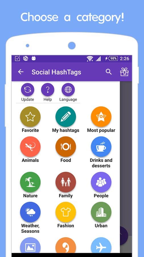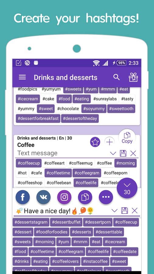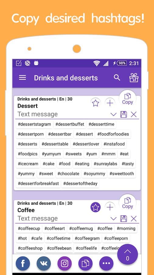 Fotoğraflarınız için hızlı ve doğru bir şekilde hashtag'leri seçmenize yardımcı olacak harika bir uygulama Instagram. Uygulama, fotoğraflarınıza, paylaşımlarınıza ve tabii ki takipçilerinize mümkün olduğunca fazla beğeni toplamanıza da yardımcı olacaktır. Bunun için tek yapmanız gereken doğru kategoriyi seçmek, beğendiğiniz etiketleri kopyalamak ve gönderinizin altına eklemektir. Uygulamada kullanışlı bir arama mevcuttur, bu yüzden tam olarak ihtiyacınız olanı hızlı ve doğru bir şekilde bulabilirsiniz. Ayrıca kendi hashtag'lerinizi oluşturabilir ve hızlı ve pratik kullanım için ayrı bir dizine ekleyebilirsiniz.