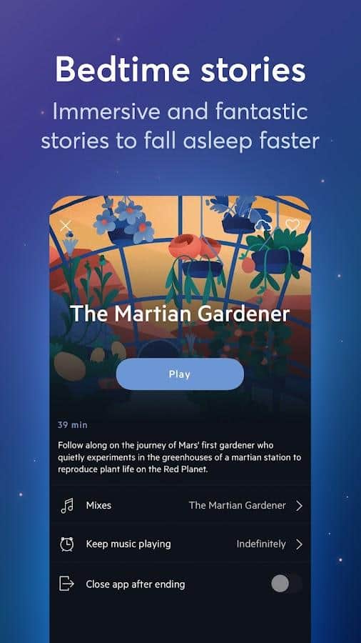Uygulama, uyku kalitesini artırmanıza ve çeşitli ses efektleri, melodiler, hikayeler ve masallar eşliğinde daha hızlı uykuya dalmanıza yardımcı olur. Uygulama, ihtiyaçlarınıza ve tercihlerinize göre kişiselleştirilebilir. Ayrıca, uygulama size uyku vakti geldiğinde hatırlatmalar yapacak ve uyku kalitenizi artırmak için seçenekler sunacaktır.
