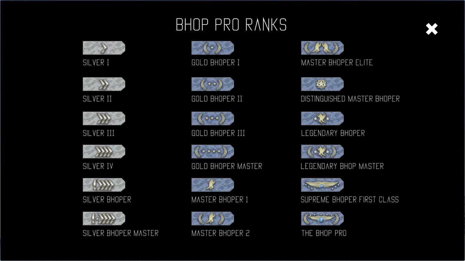 Birçok oyunda, hareketi önemli ölçüde hızlandıran özel bir atlayış şeması uygulanmaktadır. Ancak, Bunny hop'u her oyuncu başarılı bir şekilde öğrenemez; bu da oyunda büyük bir avantaj sağlar. Artık Bhop Pro, hareketlerin fiziğini anlamanıza ve bu numarayı neredeyse her oyunda gerçekleştirmeyi öğrenmenize yardımcı olacak. Yardımcı materyalleri ve araçları kullanın, ritmi yakalayın ve atlayışlarla hızlanın. Dünya oyuncu sıralamasında en iyi sonucu elde edin ve Bunny hop'un pratiğindeki deneyiminizle profesyonelliğinizi gösterin!