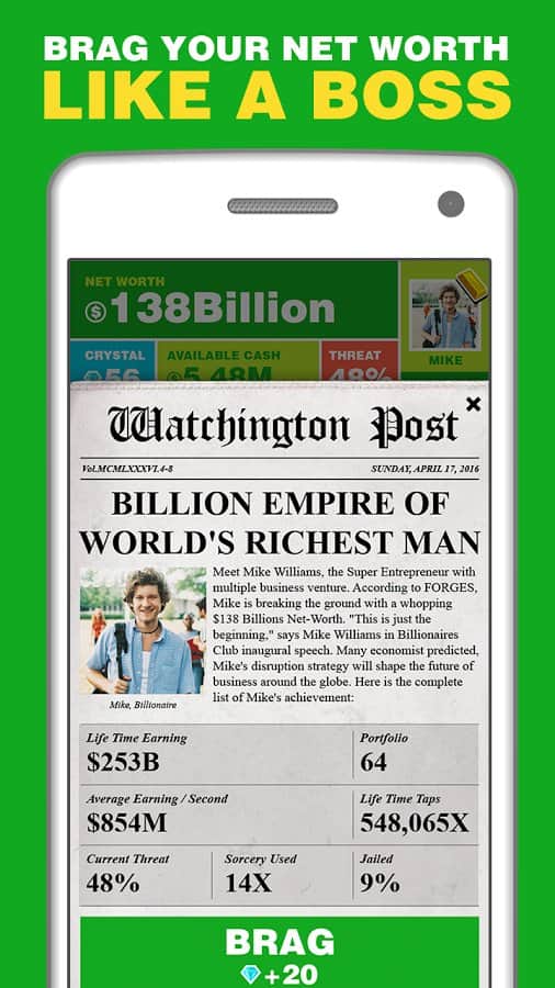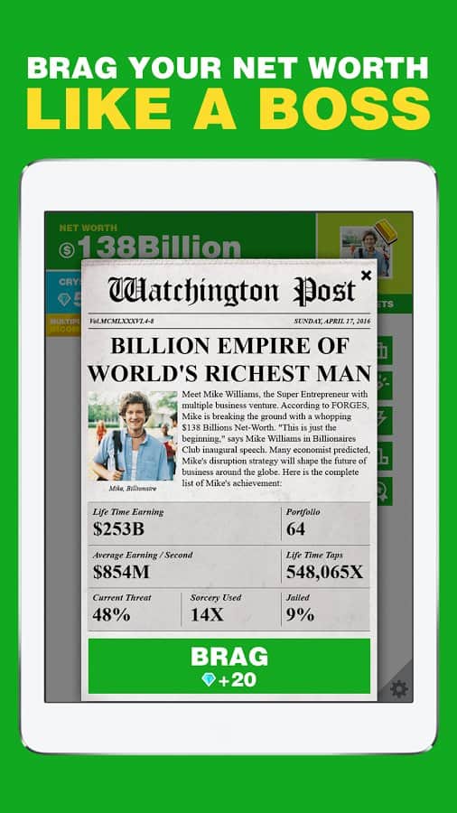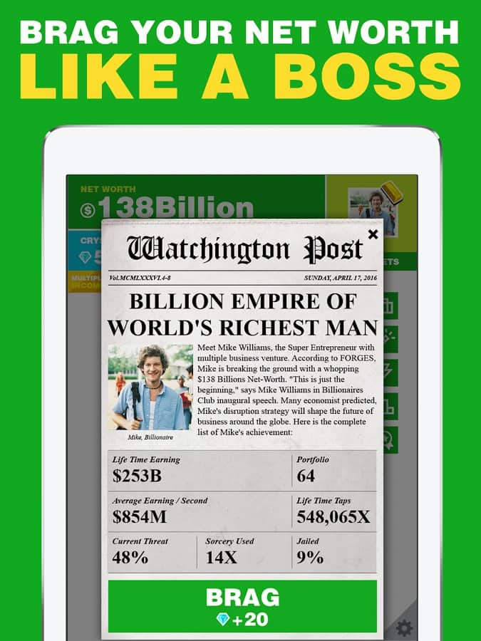 Milyarder. – herkes zengin olmayı hayal ediyor! Oyun, hayalinizi gerçekleştirmenize yardımcı olacak. Ancak, tüm zenginliklerinizin sanal olacağını unutmamalısınız. Sıfırdan yeni bir iş kurun ve bunun size muazzam paralar kazandırdığını izleyin. İş imparatorluğunuzu genişletin ve milyarder olun. Oyun, bazı ekonomik simülatörler gibi zor değil. Her şey son derece açık ve net, işimizi kuruyoruz ve para kazanıyoruz, karı yatırıyoruz ve daha fazla kazanıyoruz. Arkadaşlarınızla yarışın, hanginiz daha fazla kazanacak. Böylece oynamak çok daha eğlenceli ve ilginç hale geliyor.